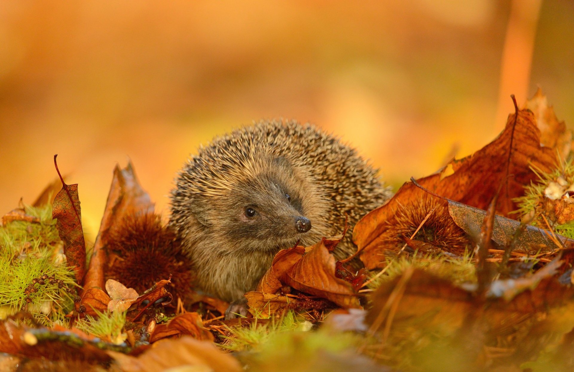 Erizo melancólico. Hojas en el bosque - fondos de pantalla