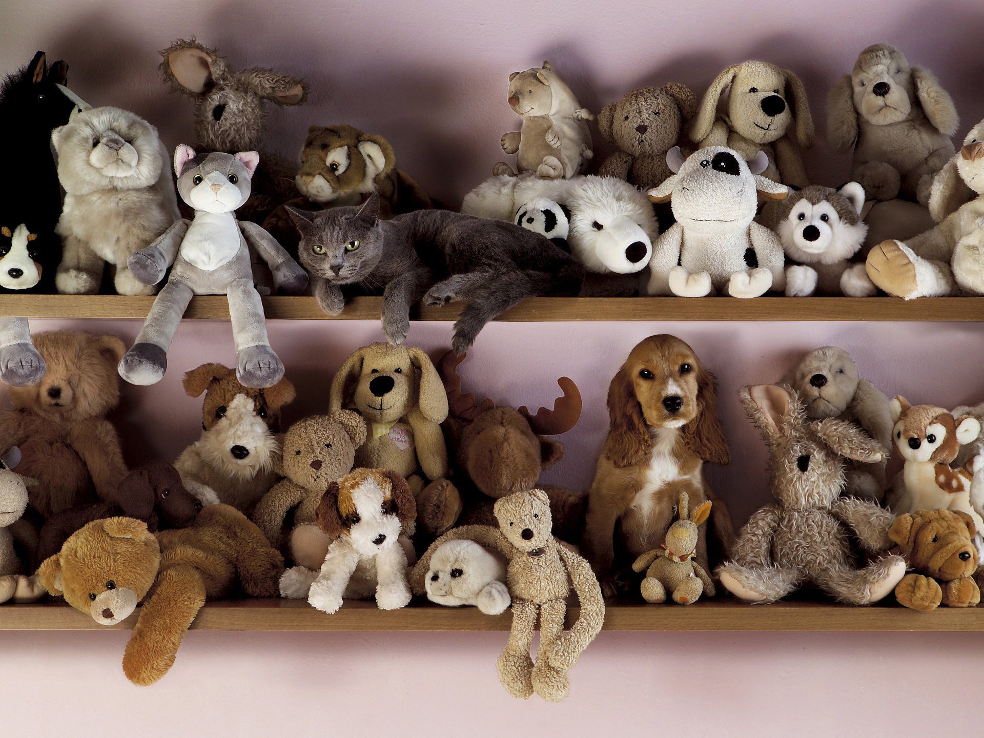 Muchos juguetes de peluche en los estantes - fondos de pantalla