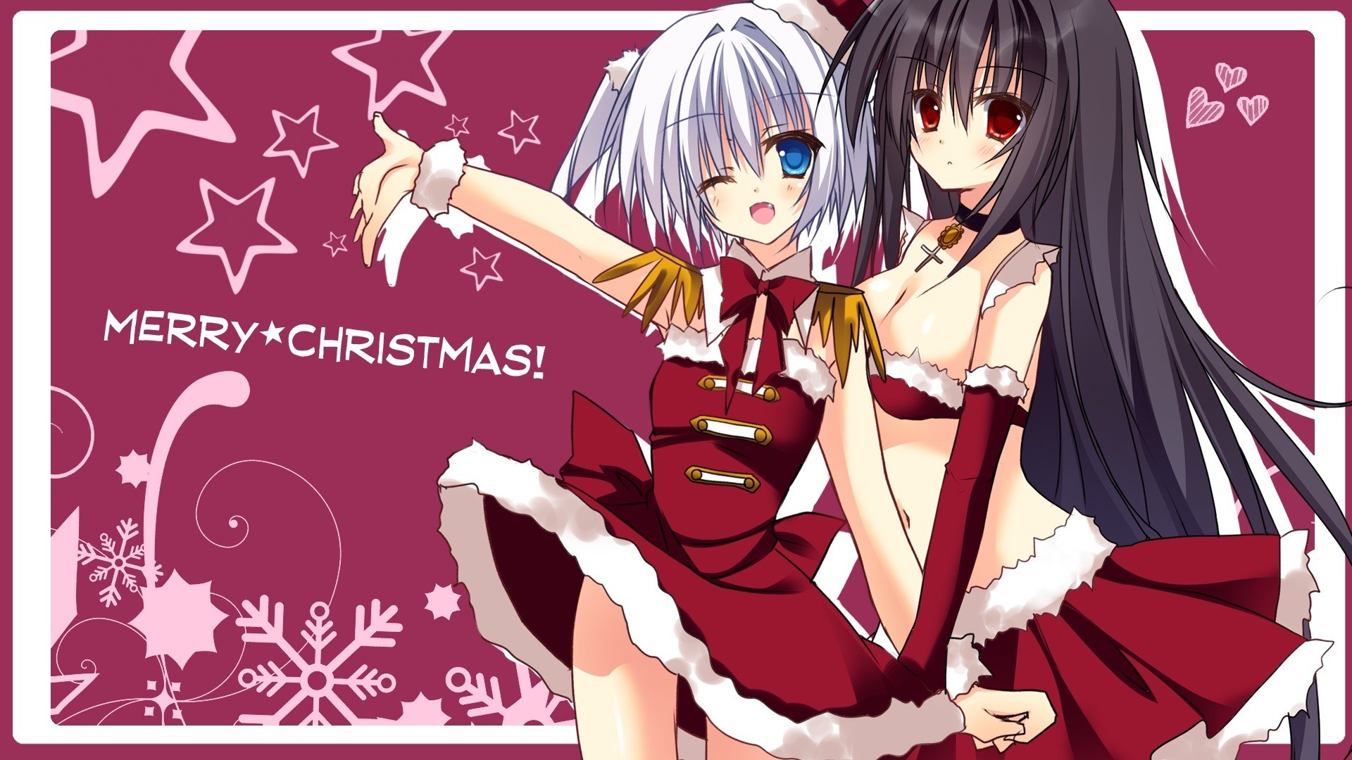 Etiquetas:pelo corto, guiño, bikini, rubor, arco, pelo largo, 2girls, collar, colmillo