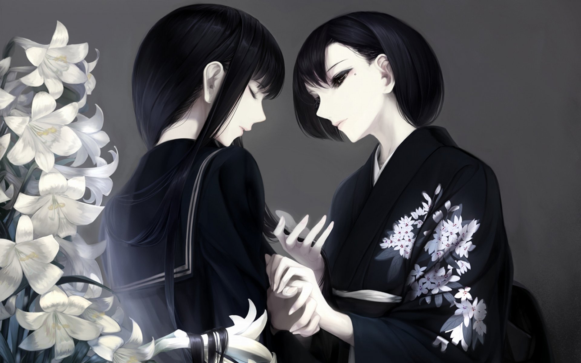 Chicas en kimono con flores de lirio - fondos de Escritorio