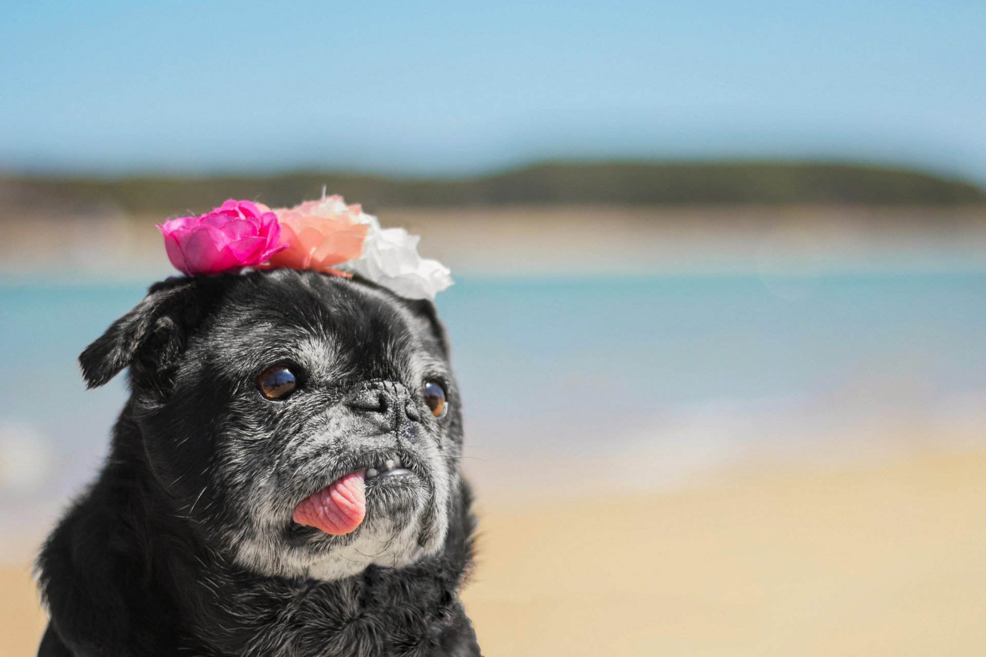 Perro saca la lengua, flores en la cabeza - fondos de Escritorio