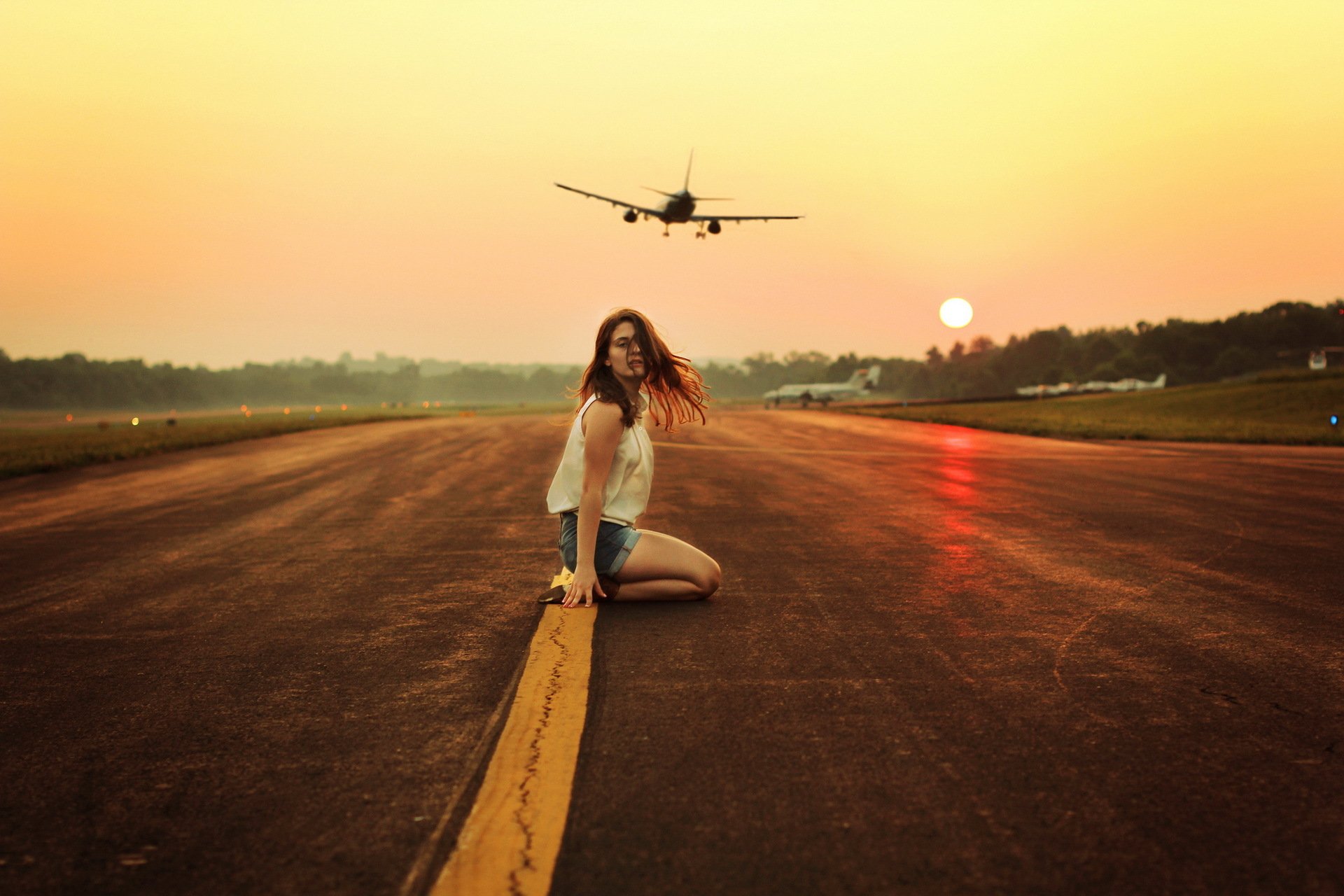 Chica delgada de pelo oscuro se sienta en el camino - fondos de Escritorio