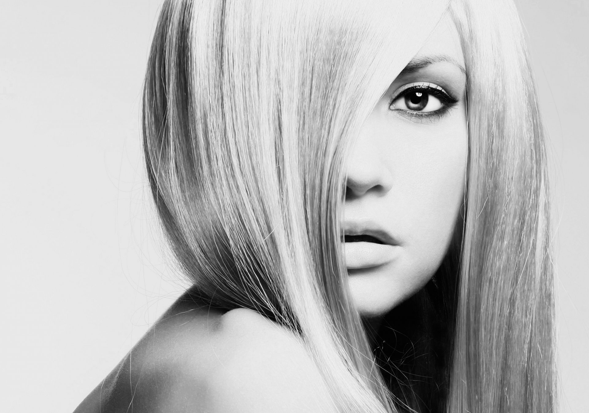 chica mirada ojos cara rubia pelo hombro blanco y negro fondo