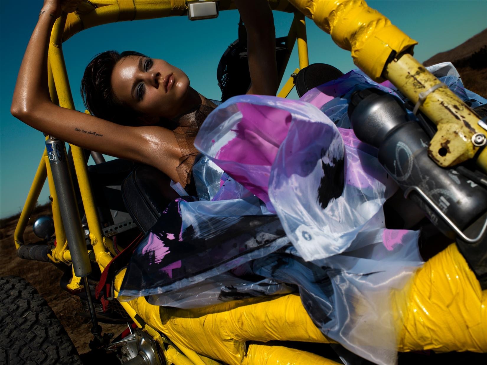 Chica en vestido monta una motocicleta amarilla - fondos de pantalla