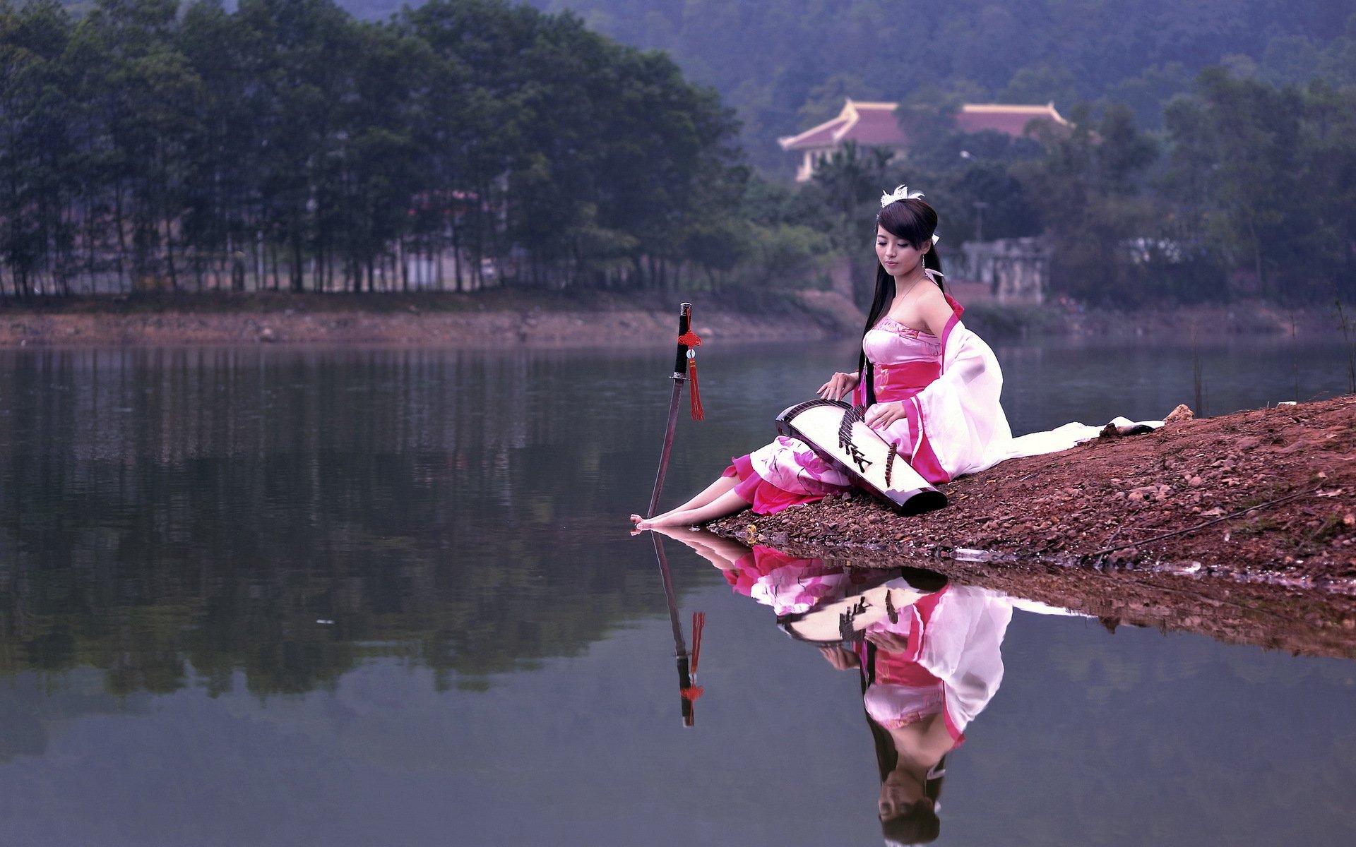 Hermosa chica y armas cerca del lago - fondos de pantalla