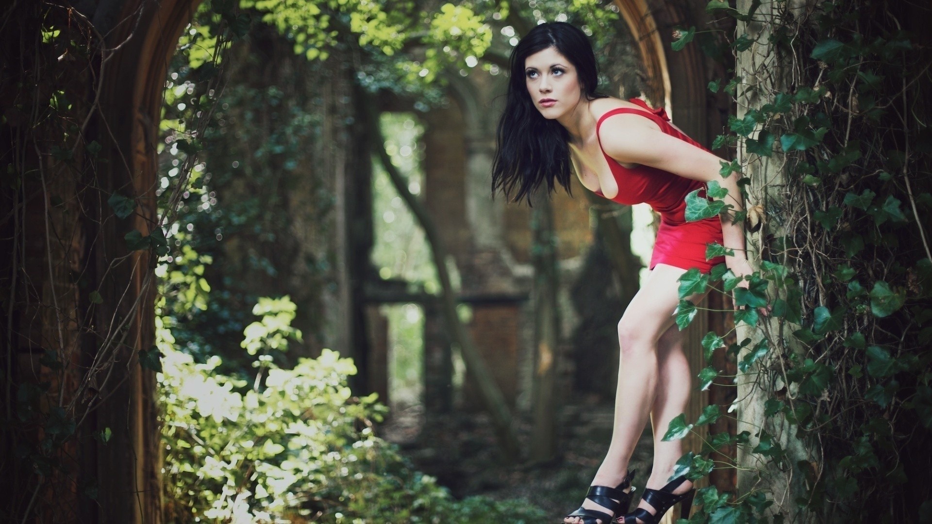 Morena en vestido rojo en el fondo de la naturaleza - fondos de pantalla
