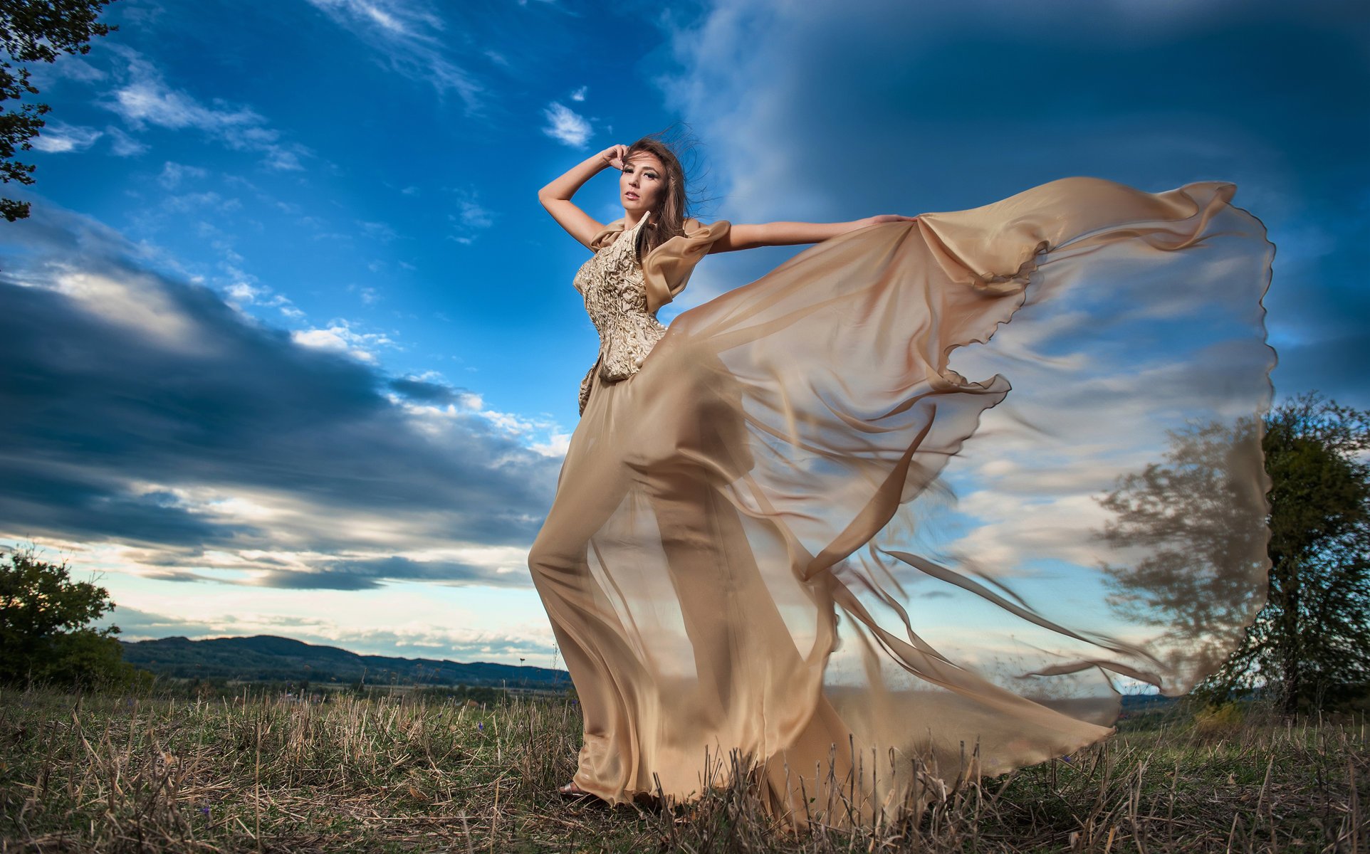 Una chica con un hermoso vestido posa contra el cielo - fondos de pantalla