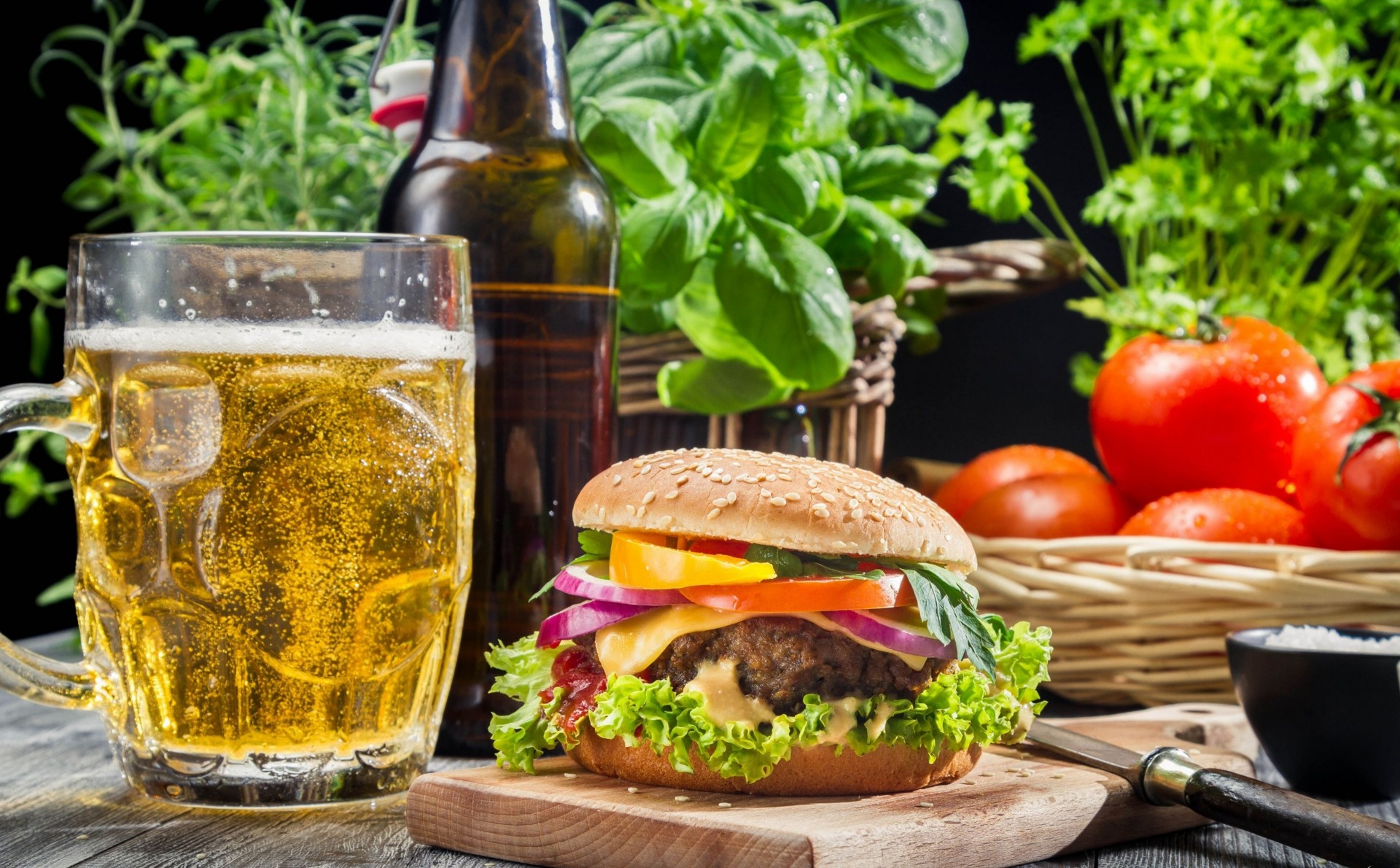 Hamburguesa jugosa con una taza de cerveza - fondos de pantalla