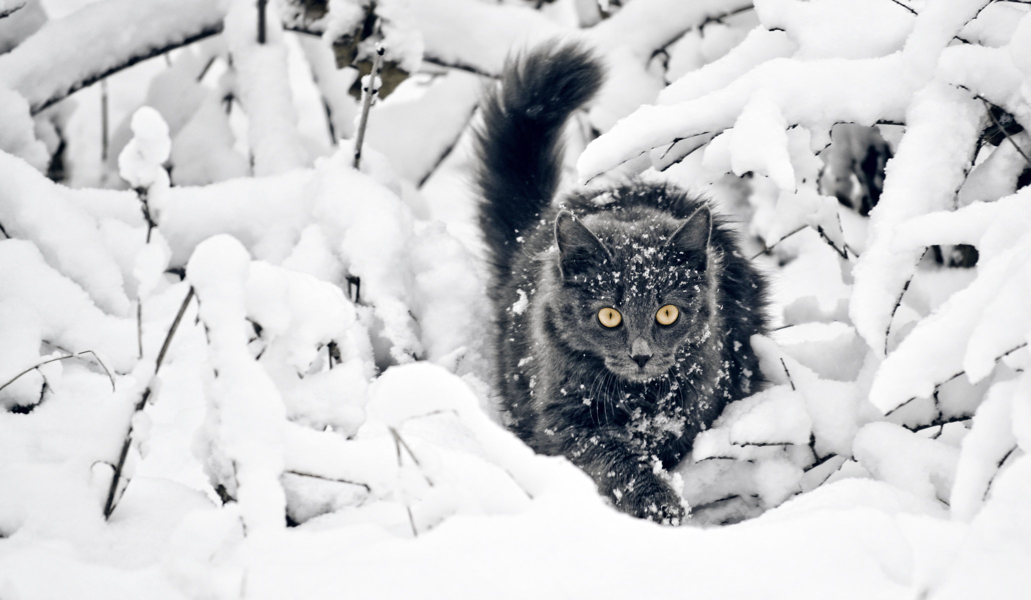 El gato cubierto de nieve se arrastra sobre la nieve - fondos de pantalla