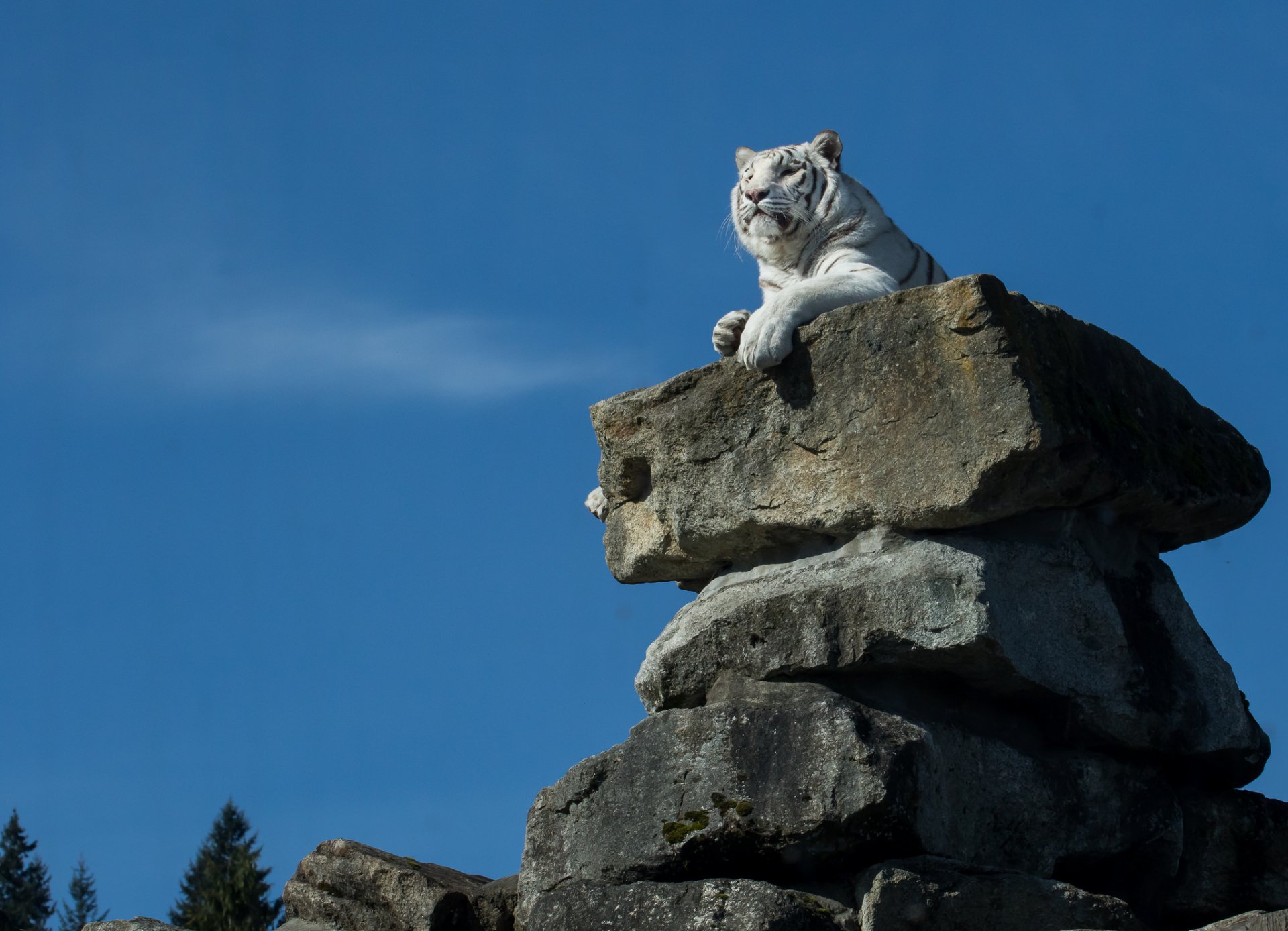 Etiquetas:tigre blanco, tigre, piedras, trono, sentado alto, mirando lejos