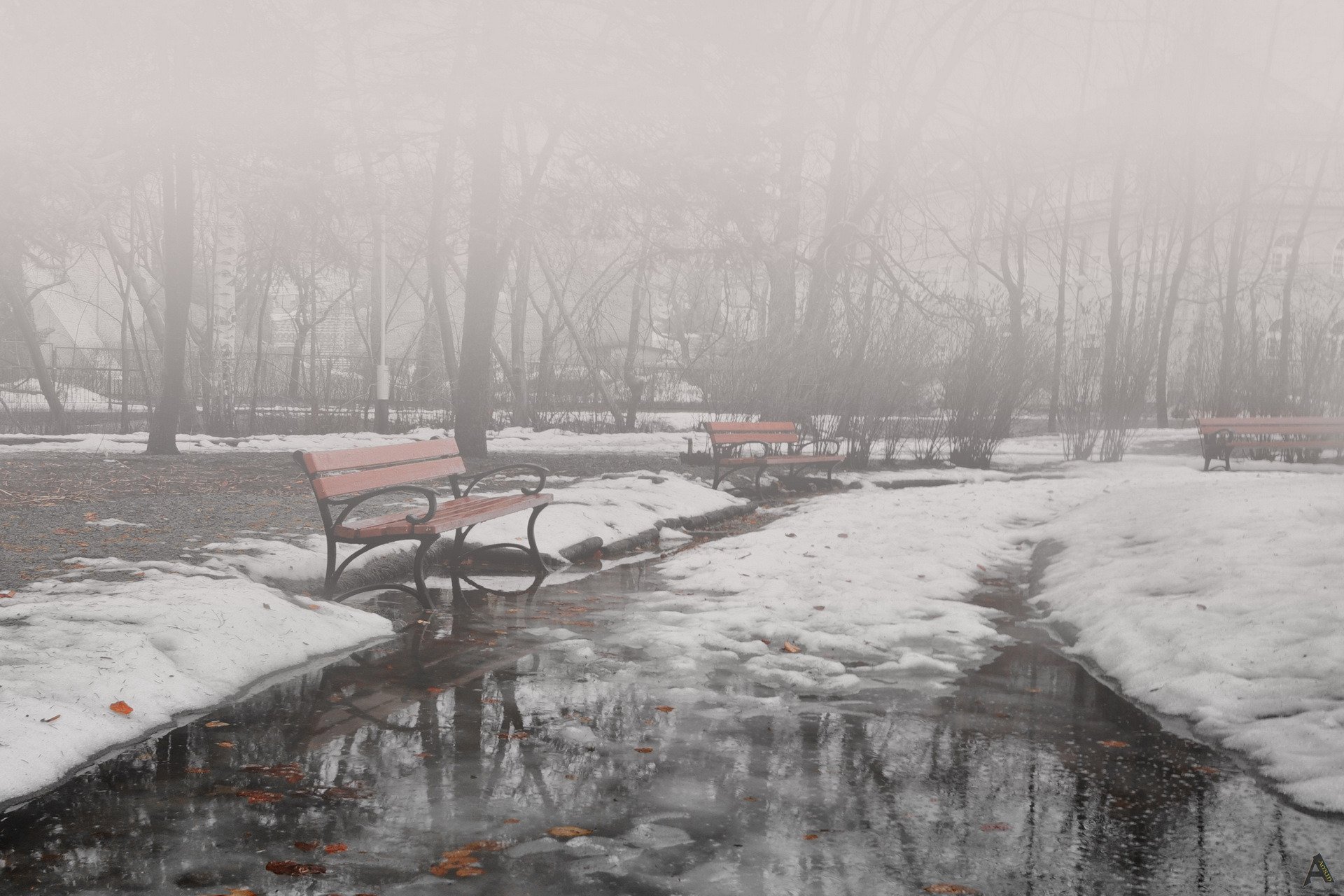 Nieve derretida en el parque y niebla - fondos de Escritorio