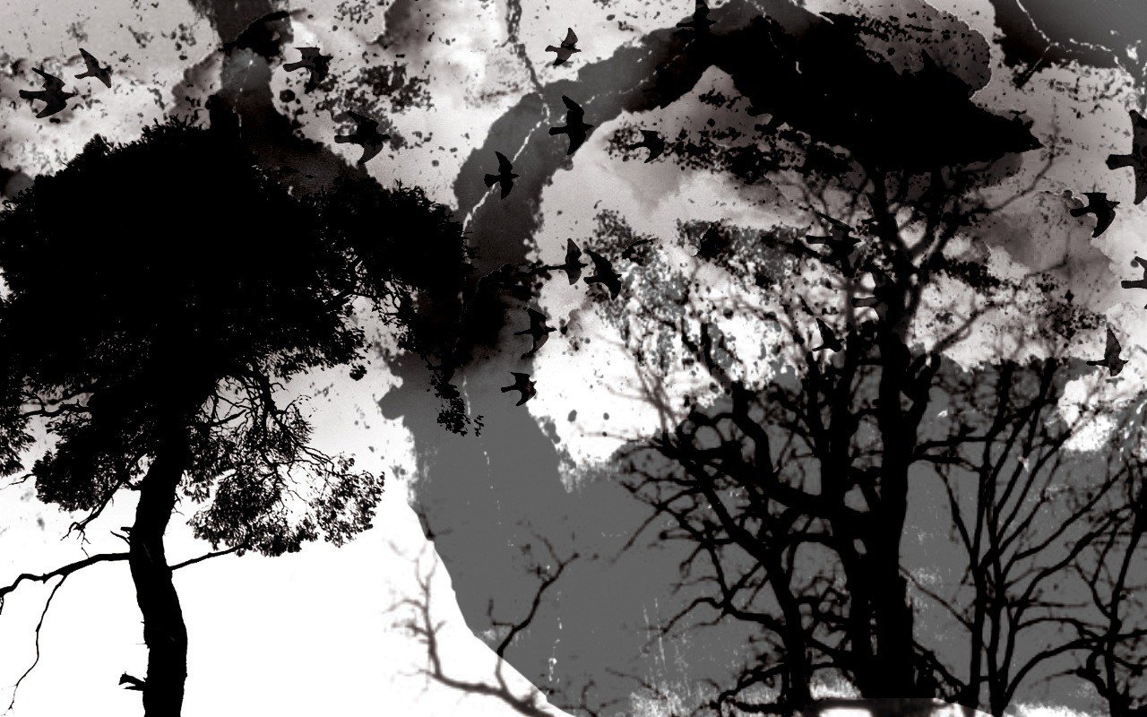 Árboles negros y pájaros contra un cielo oscuro - fondos de pantalla