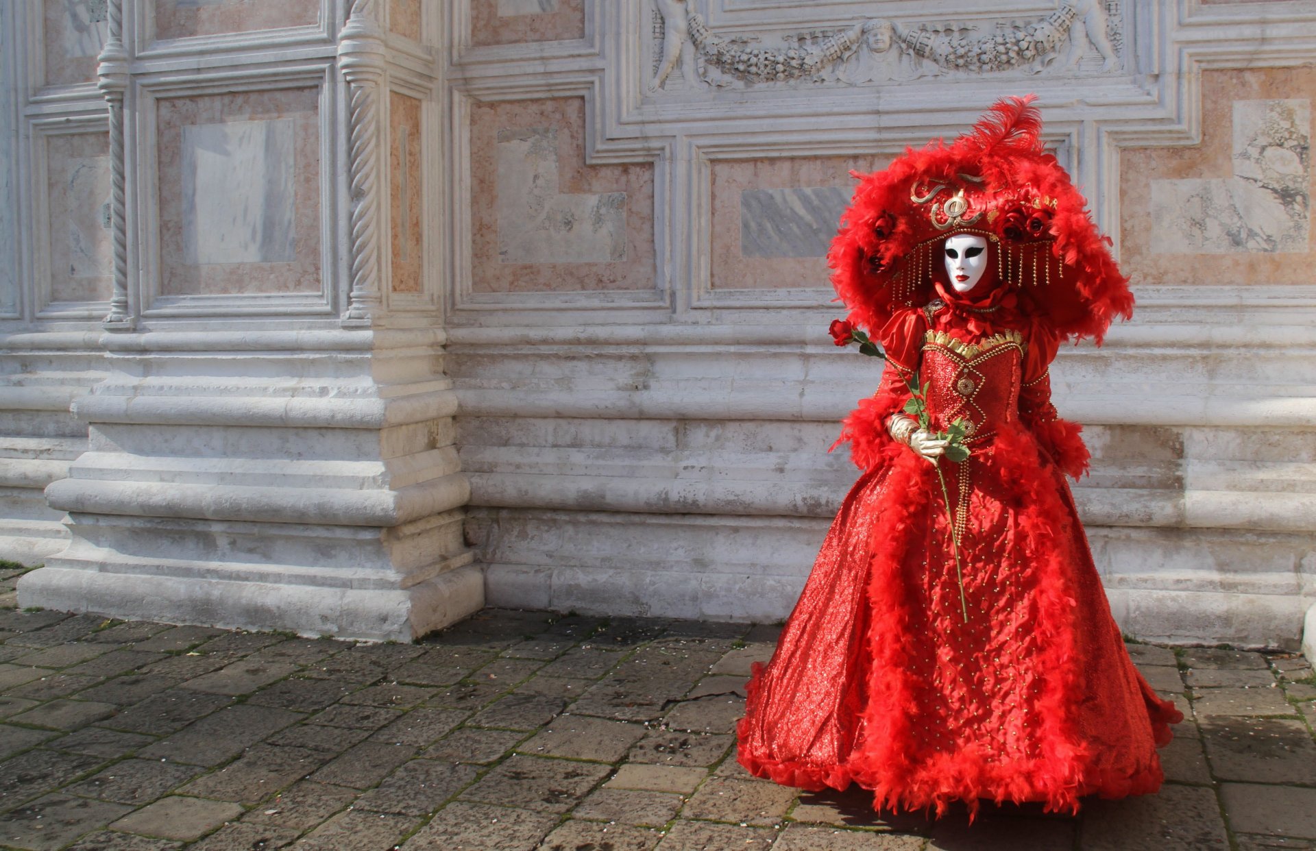 Etiquetas:chica, vestido de carnaval, rojo, máscara, sombrero, flor, rosa, pared