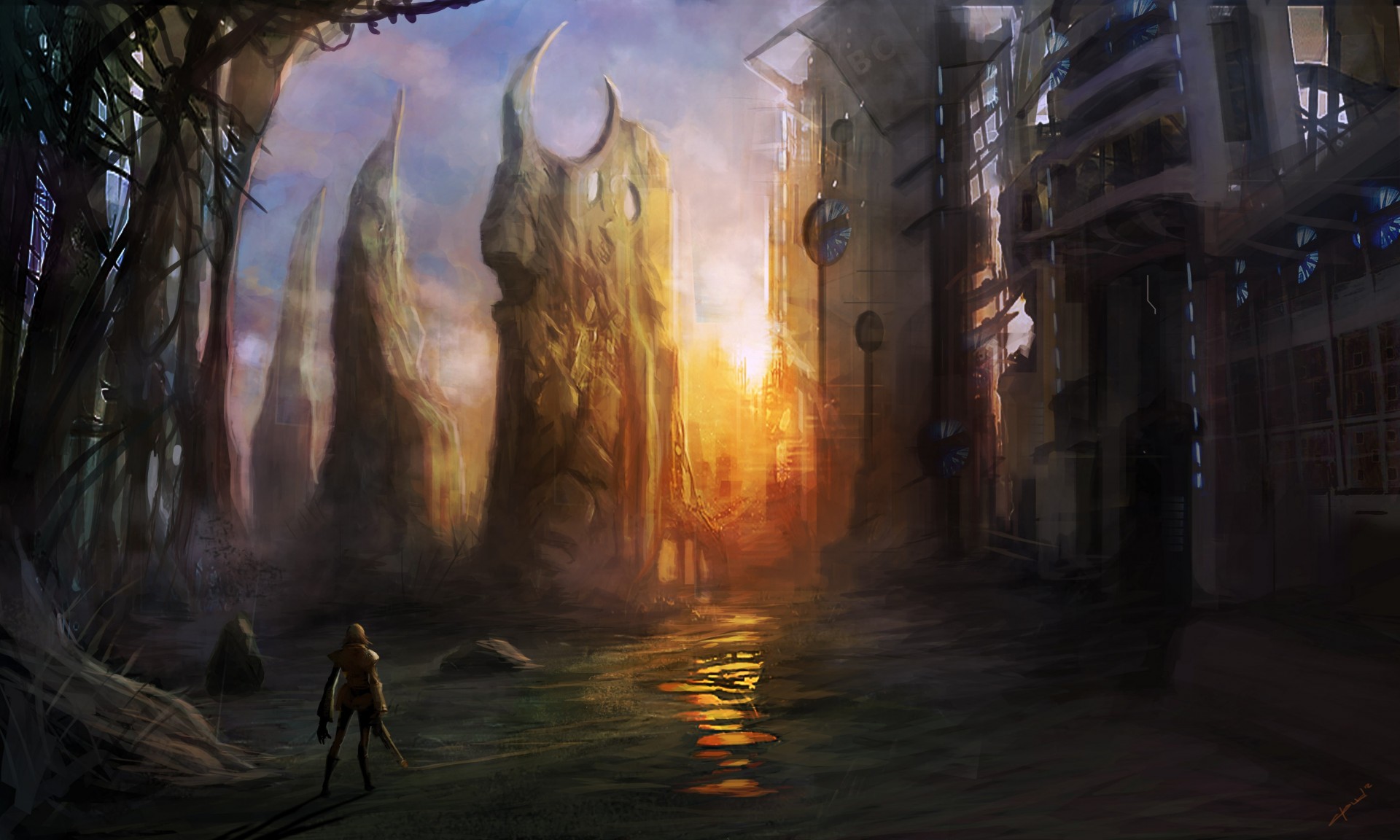 Dibujo de una ciudad fantástica y un hombre - fondos de Escritorio