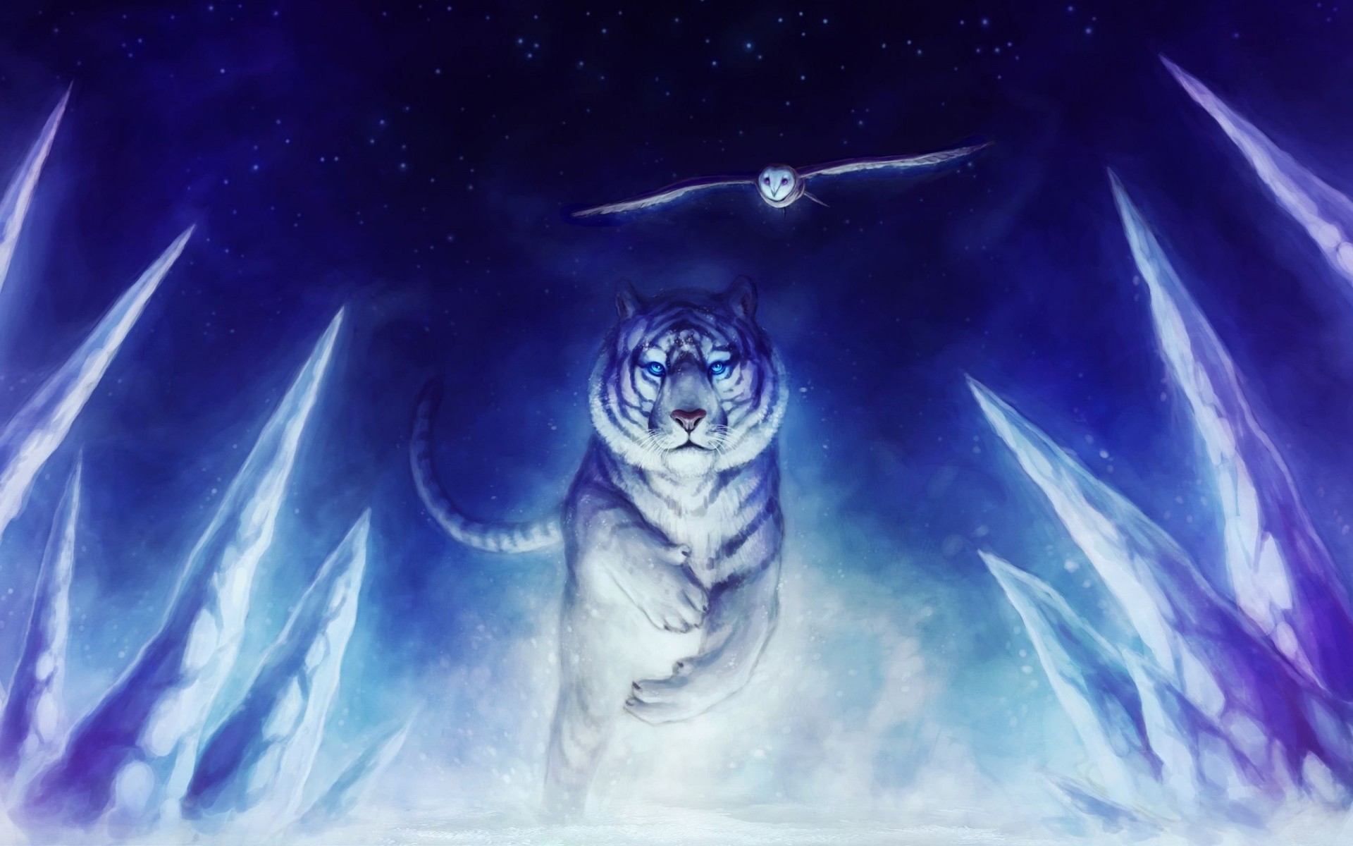 Tigre blanco con búho volador - fondos de Escritorio