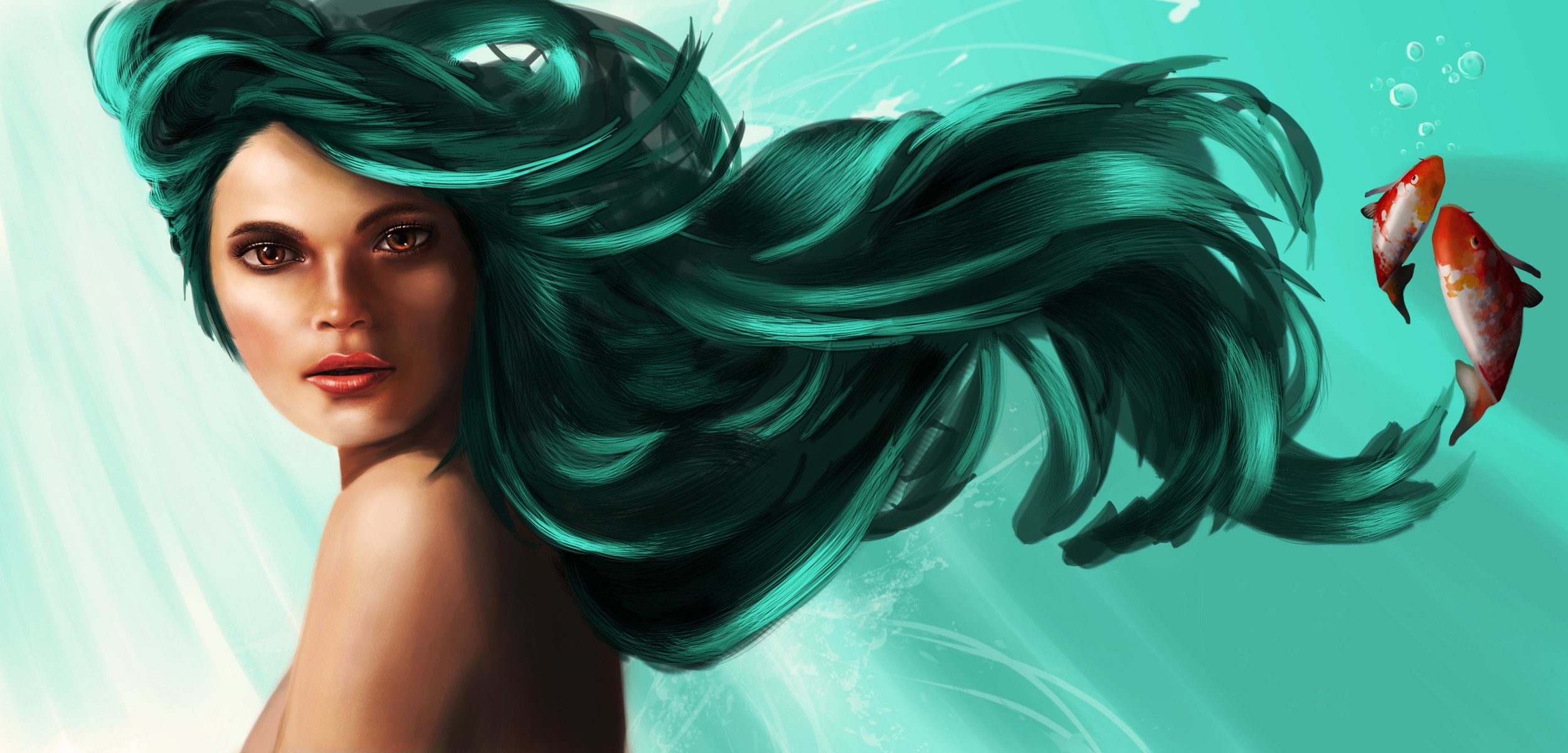 arte chica sirena mirada cara cabello verde hombros peces océano agua