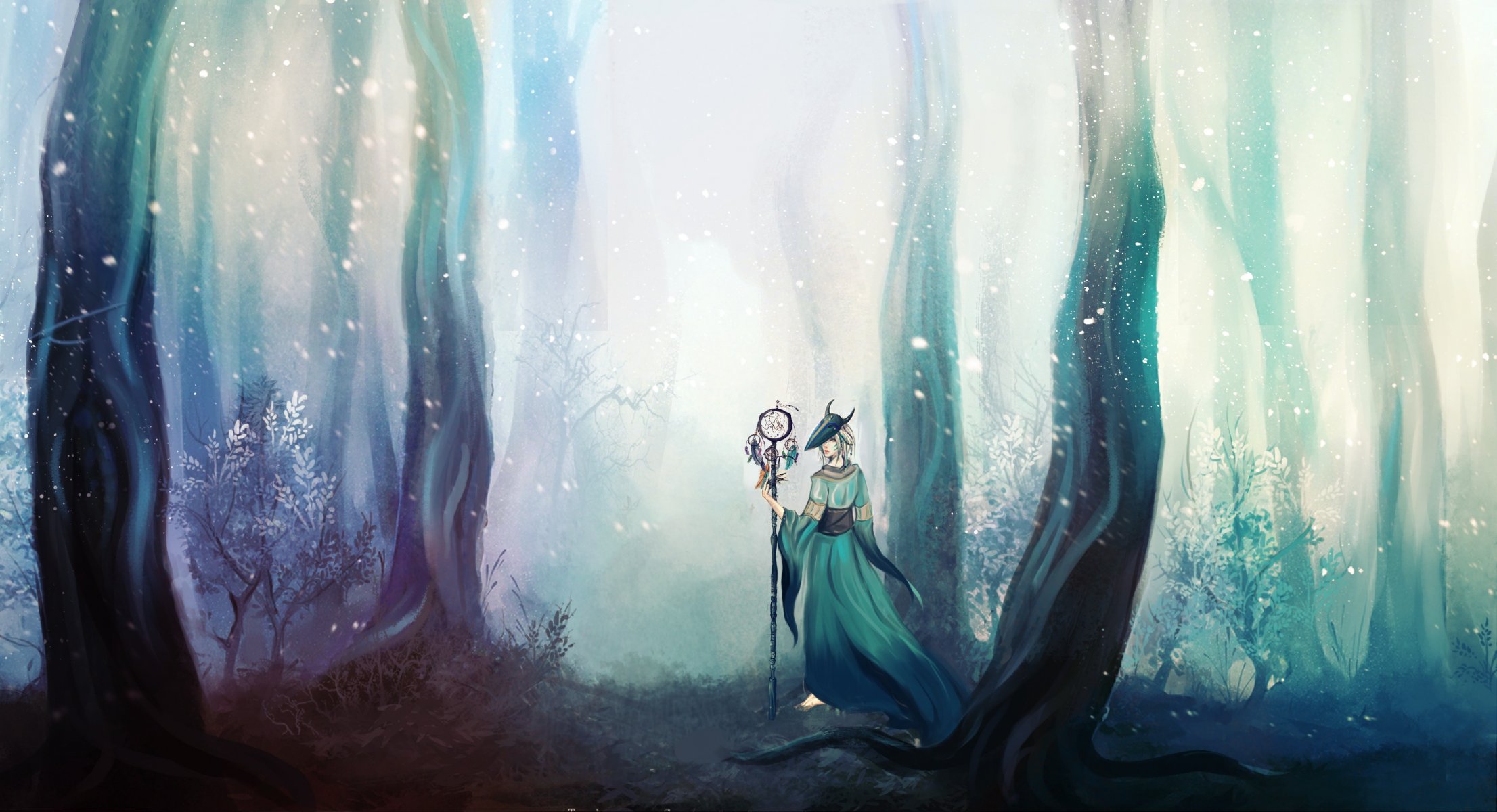 Chica mítica con un bastón en el bosque - fondos de pantalla
