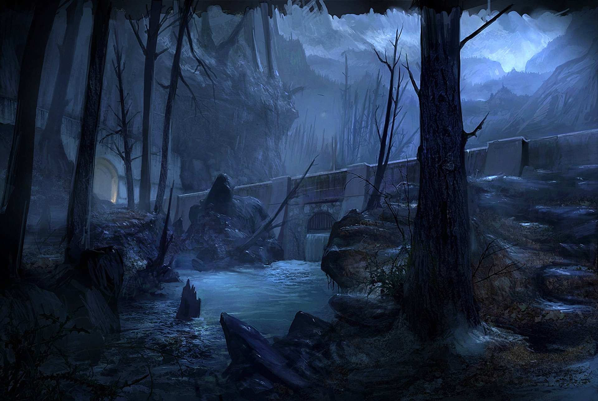 Etiquetas:arte, montañas, noche, puente, río, árboles, rocas, piedras
