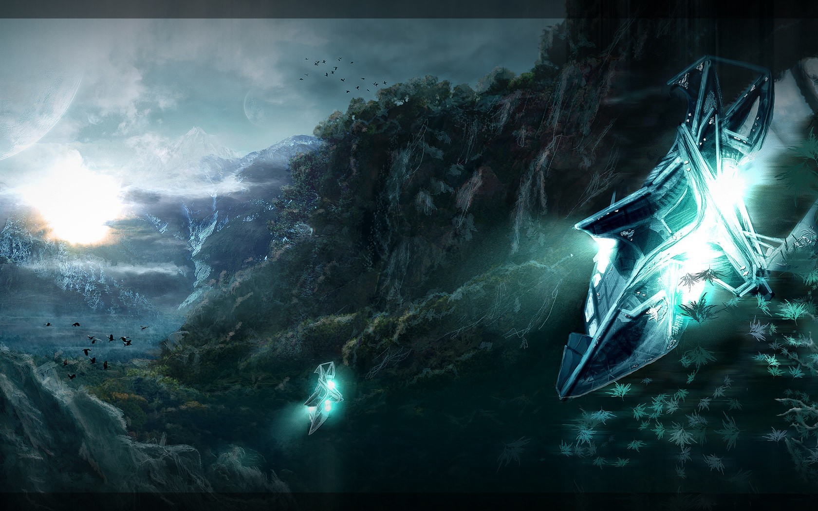 Un barco luminoso vuela por la noche sobre el bosque - fondos de pantalla
