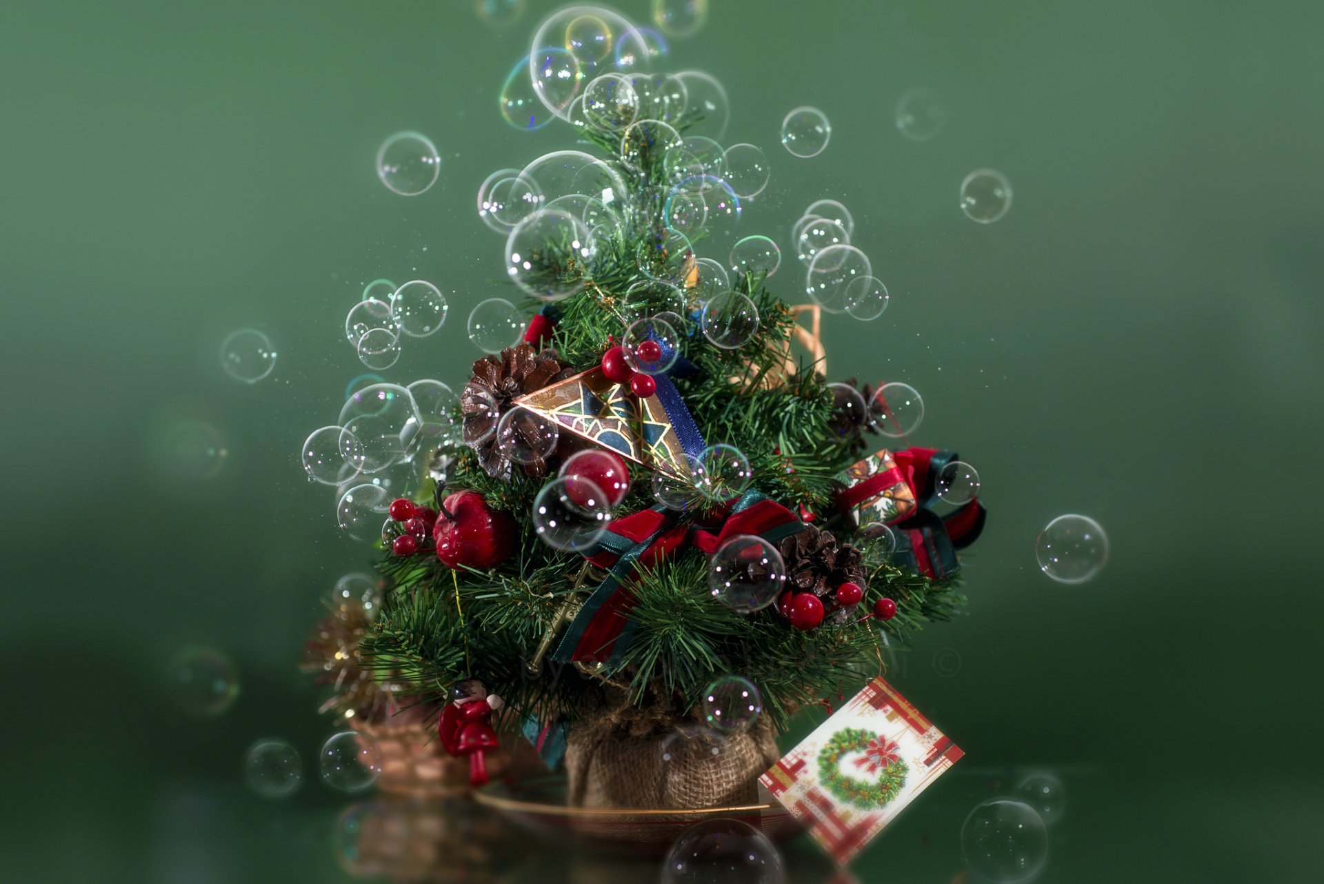 Pequeño árbol de Navidad con juguetes sobre un fondo verde - fondos de pantalla