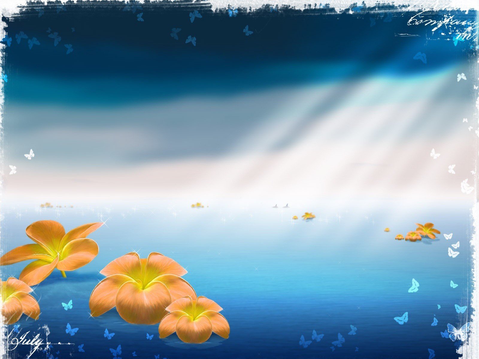 Flores y mariposas en el mar azul - fondos de Escritorio
