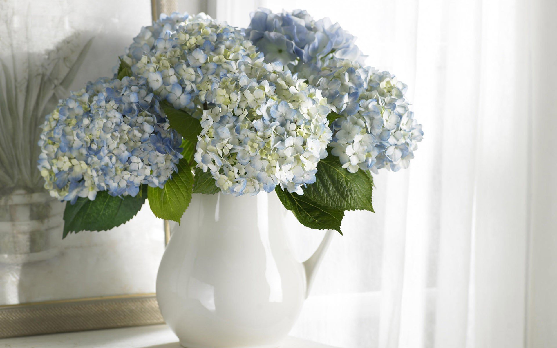 Jarrón blanco con ramo de hortensias - fondos de Escritorio