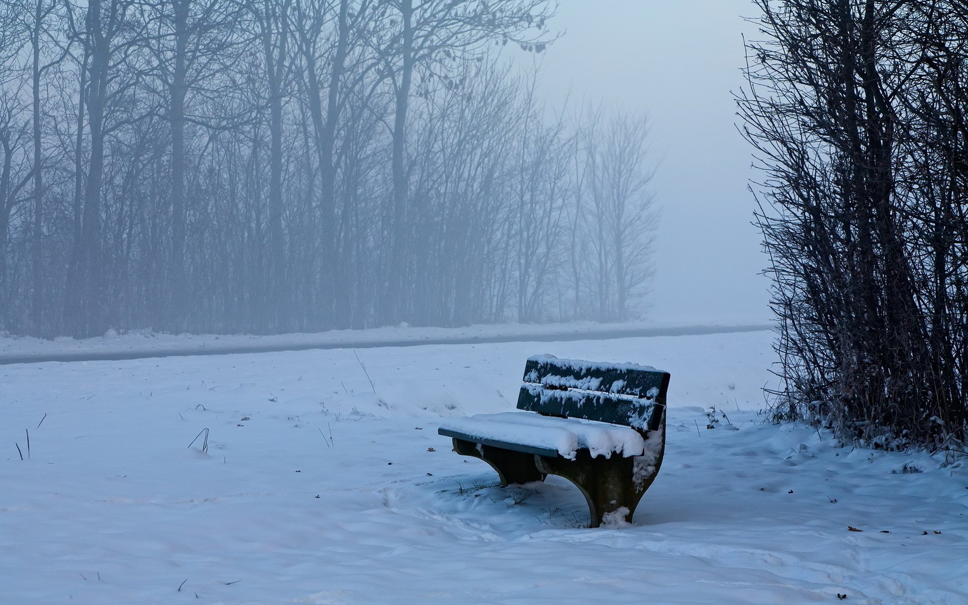 Banco cubierto de nieve en el parque brumoso - fondos de Escritorio