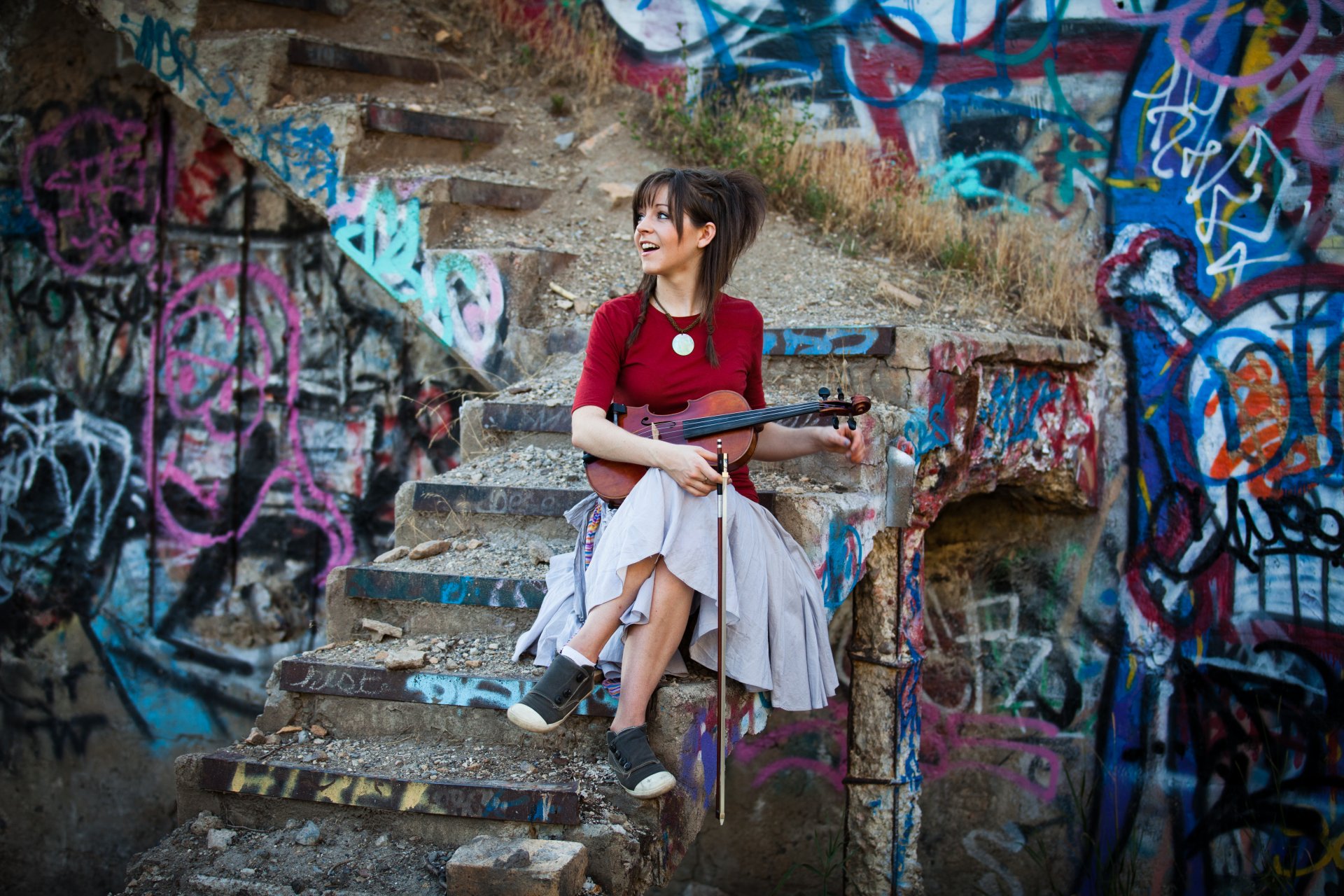 Violinista alegre en el fondo de un edificio abandonado - fondos de pantalla