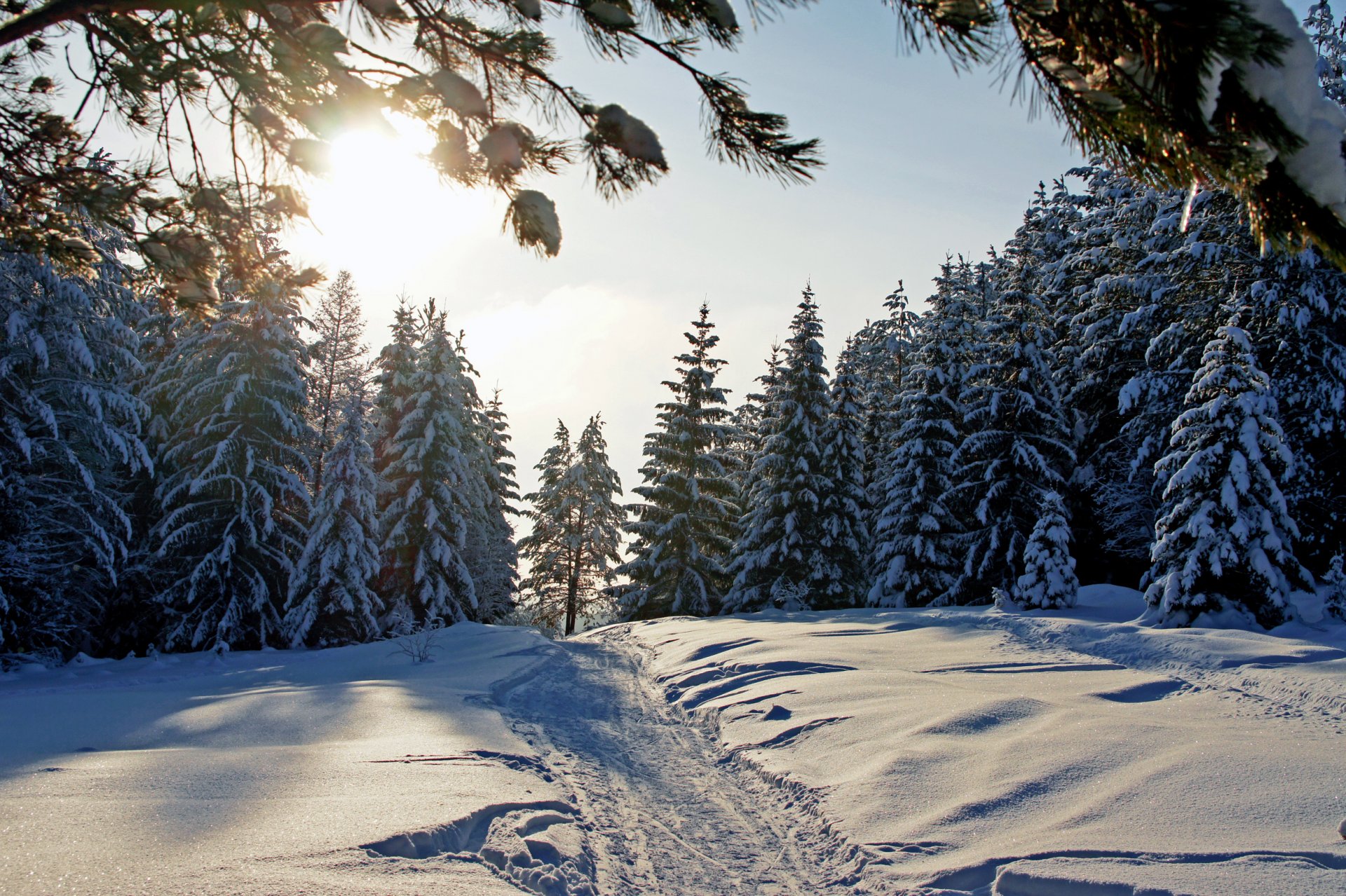 Camino en el bosque de invierno en el sol radiante - fondos de Escritorio