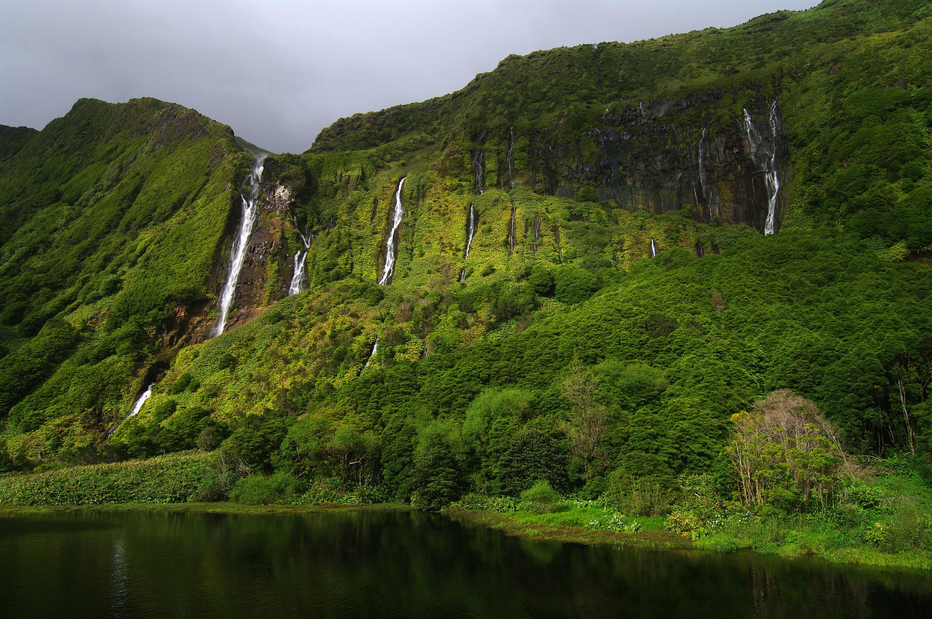 Paisaje con montañas verdes y cascadas - fondos de Escritorio