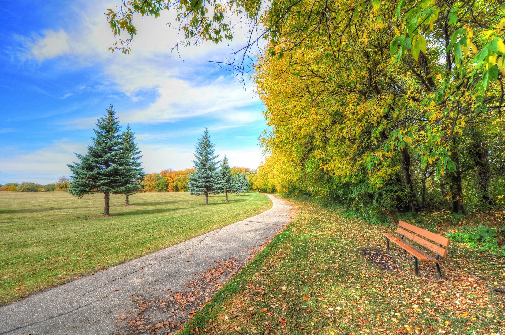 Etiquetas:naturaleza, parque, árboles, hierba, otoño, banco, abeto, camino, cielo, nubes