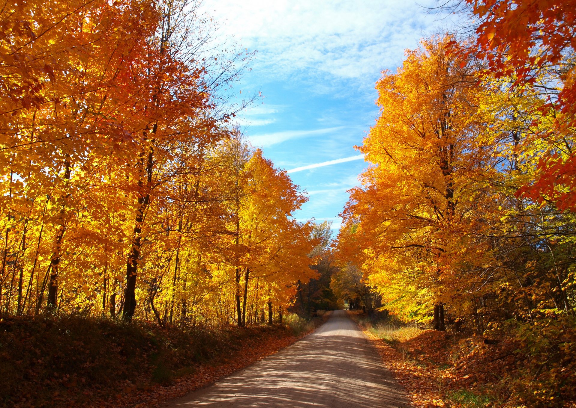 otoño bosque árboles hojas amarillo camino cielo azul sol