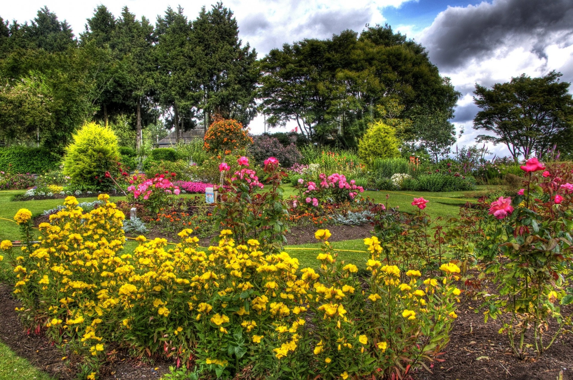 árboles amarillo flores rosas jardín