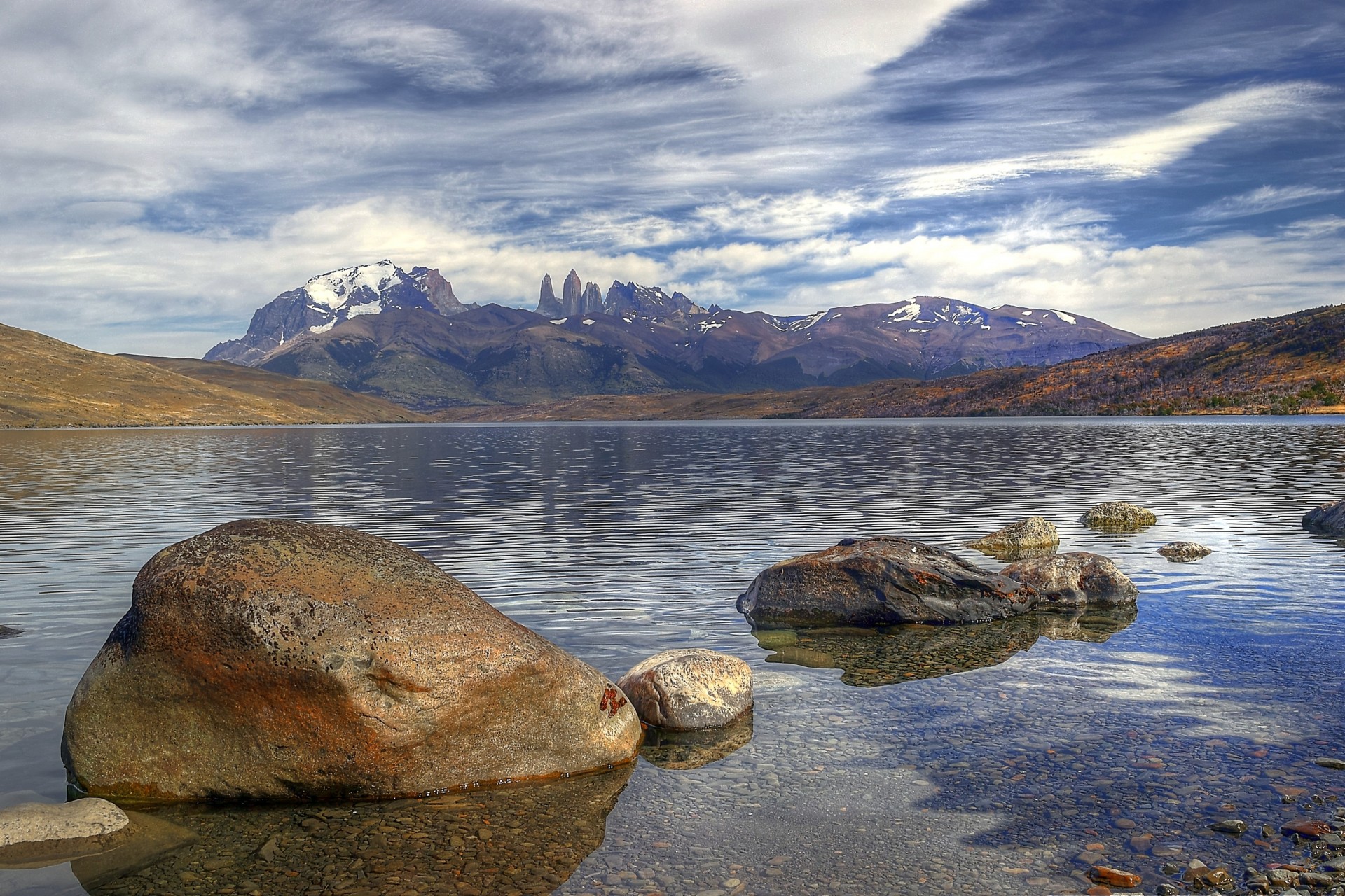 Piedras en el agua y en las montañas nieve - fondos de pantalla