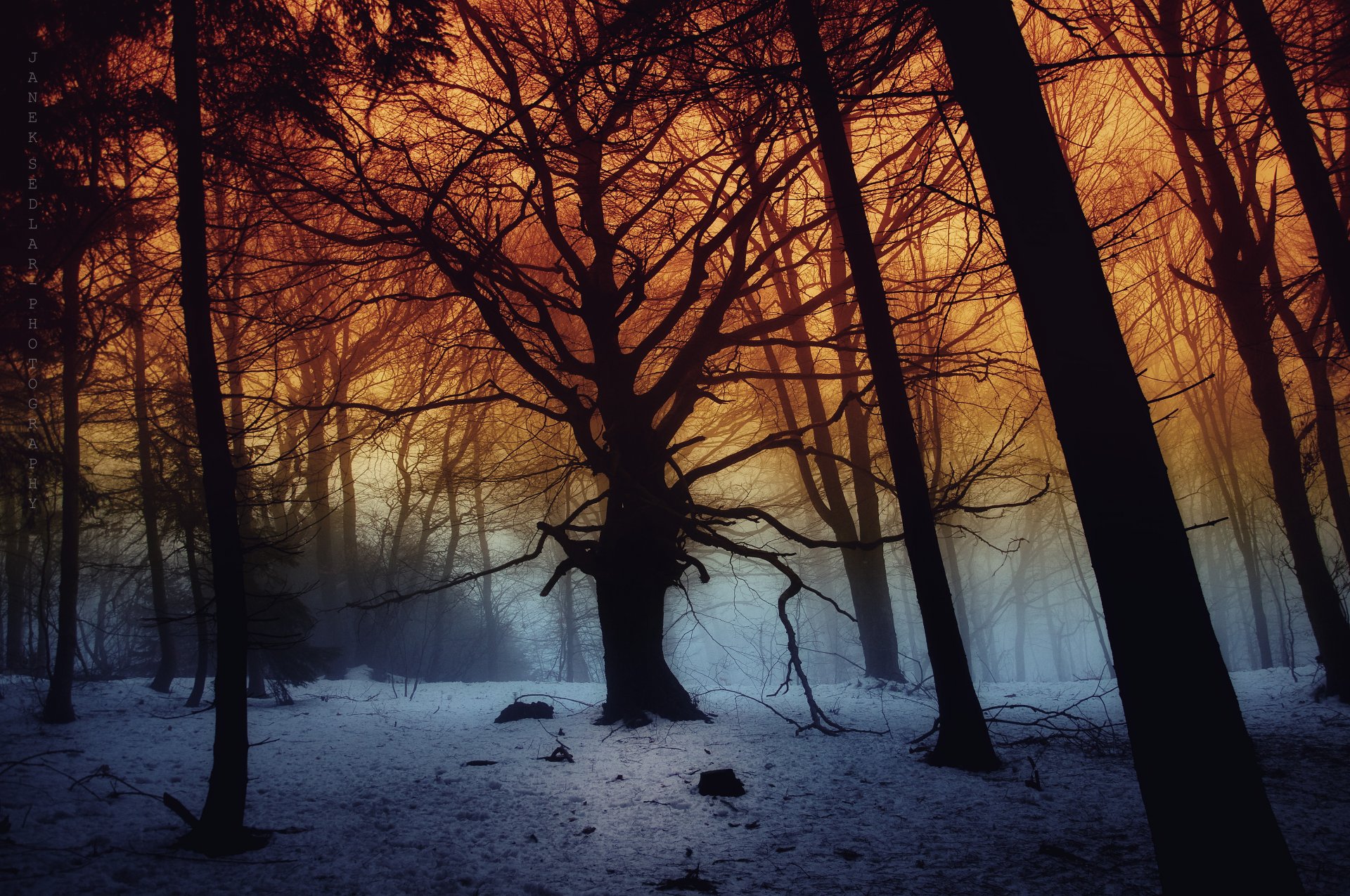 Bosque oscuro en la niebla entre la nieve - fondos de Escritorio