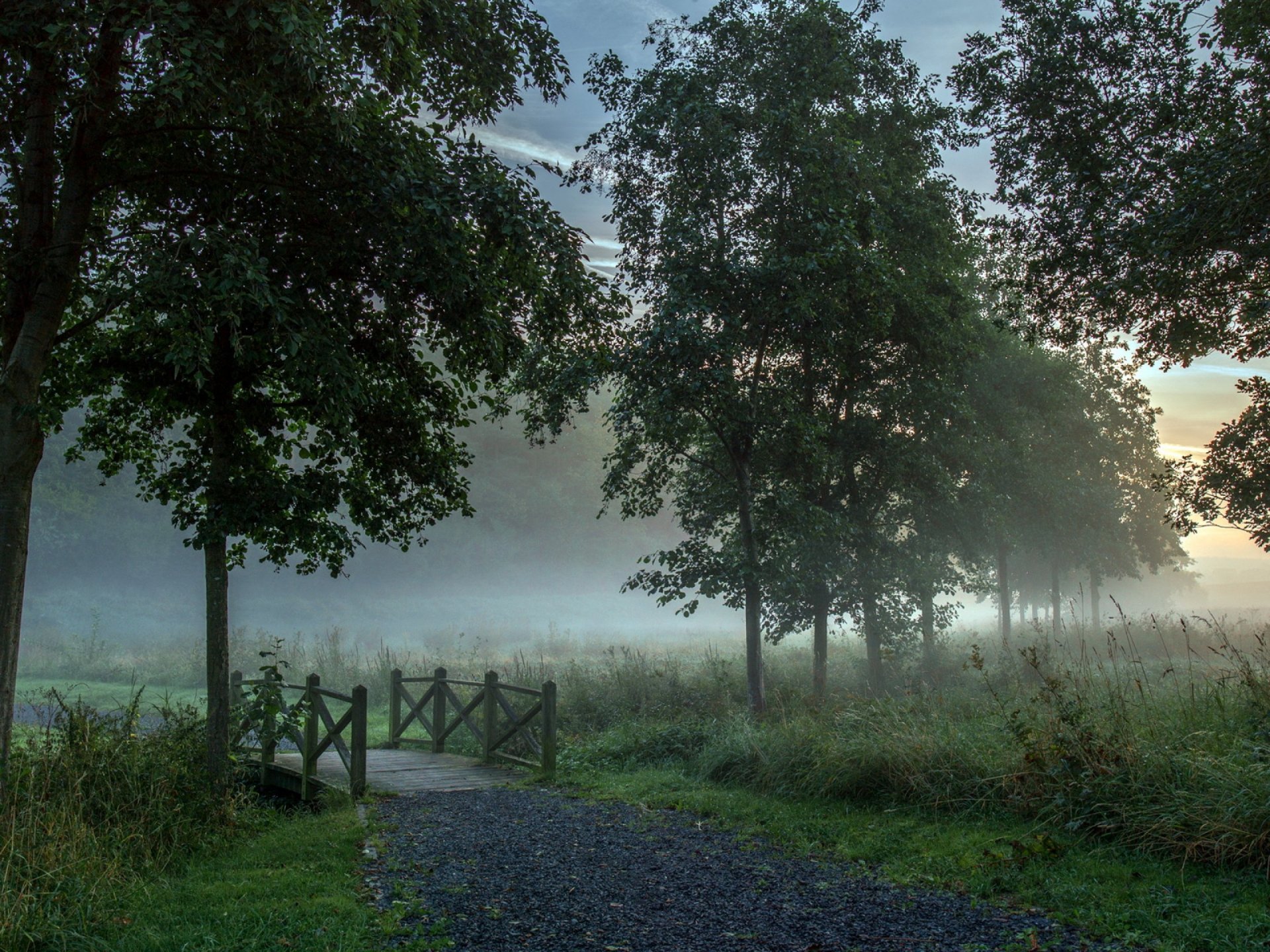 Brumoso paisaje de la mañana con el puente
