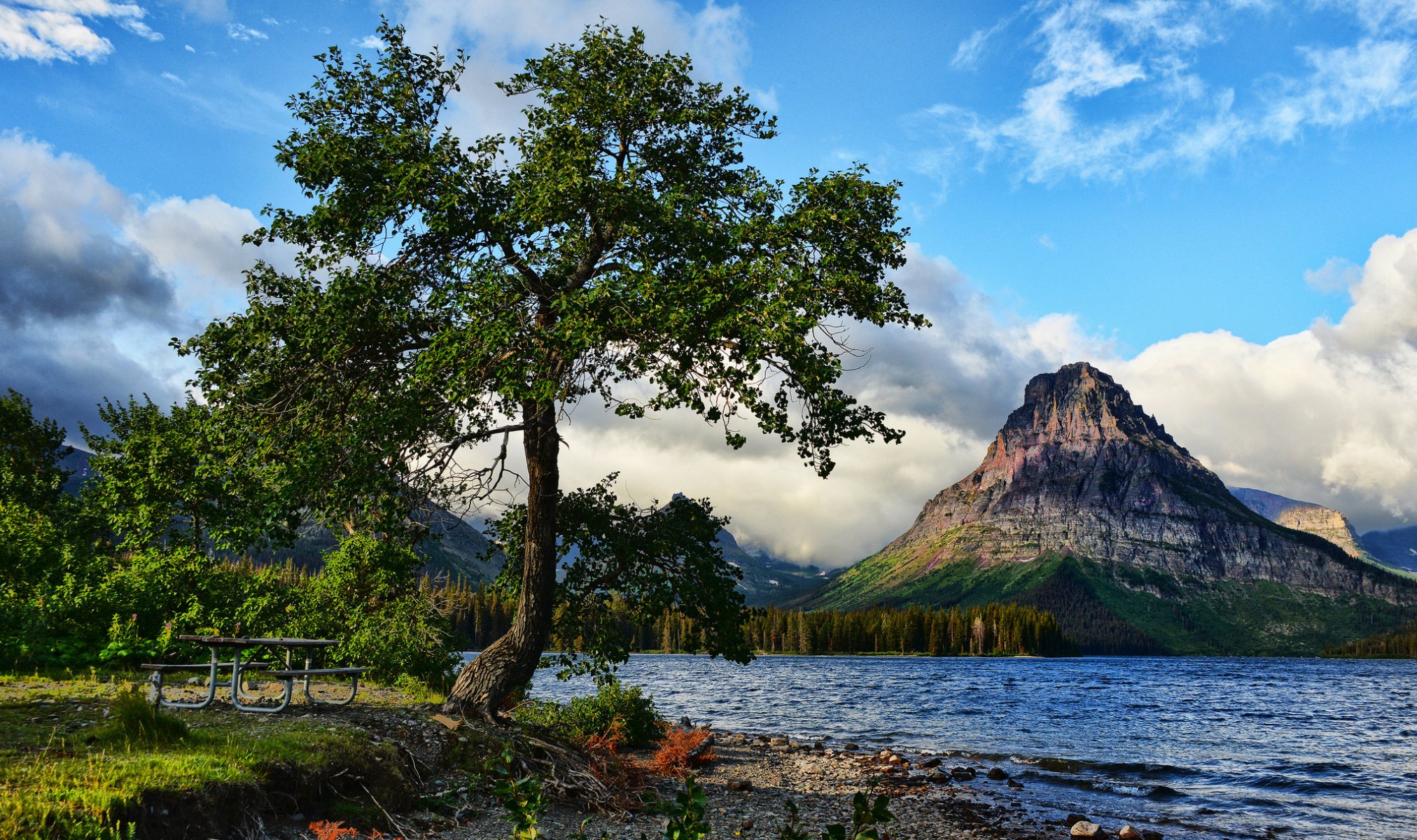 Paisaje de árbol colorido junto al lago de montaña - fondos de Escritorio