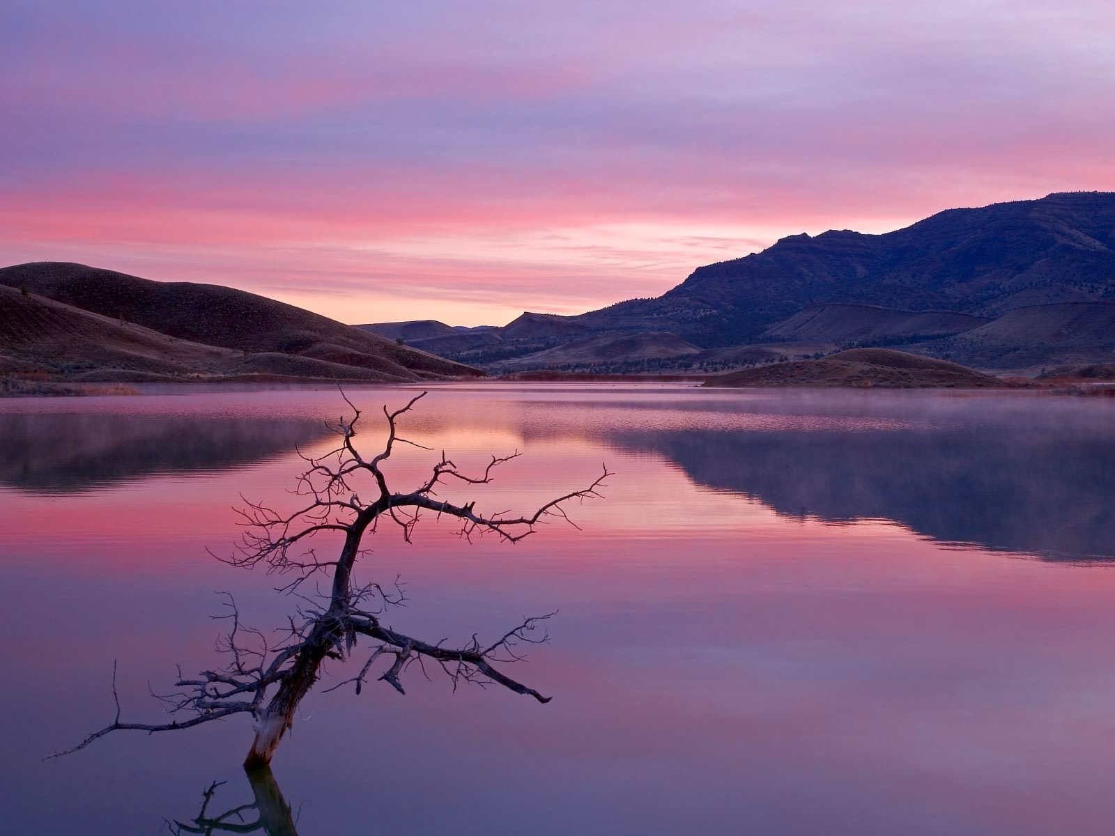 Árbol desnudo en el fondo de una puesta de sol escarlata - fondos de Escritorio