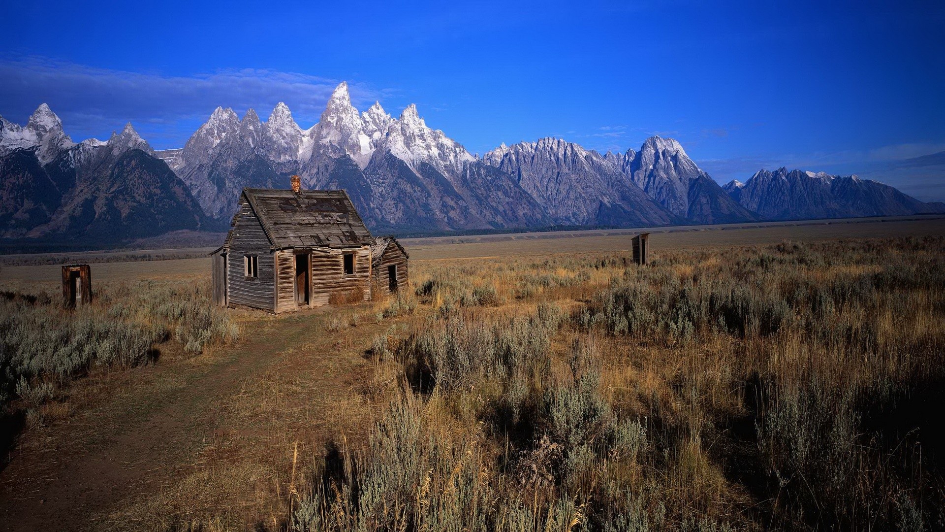 Cabaña abandonada en la estepa en el fondo de las montañas - fondos de pantalla