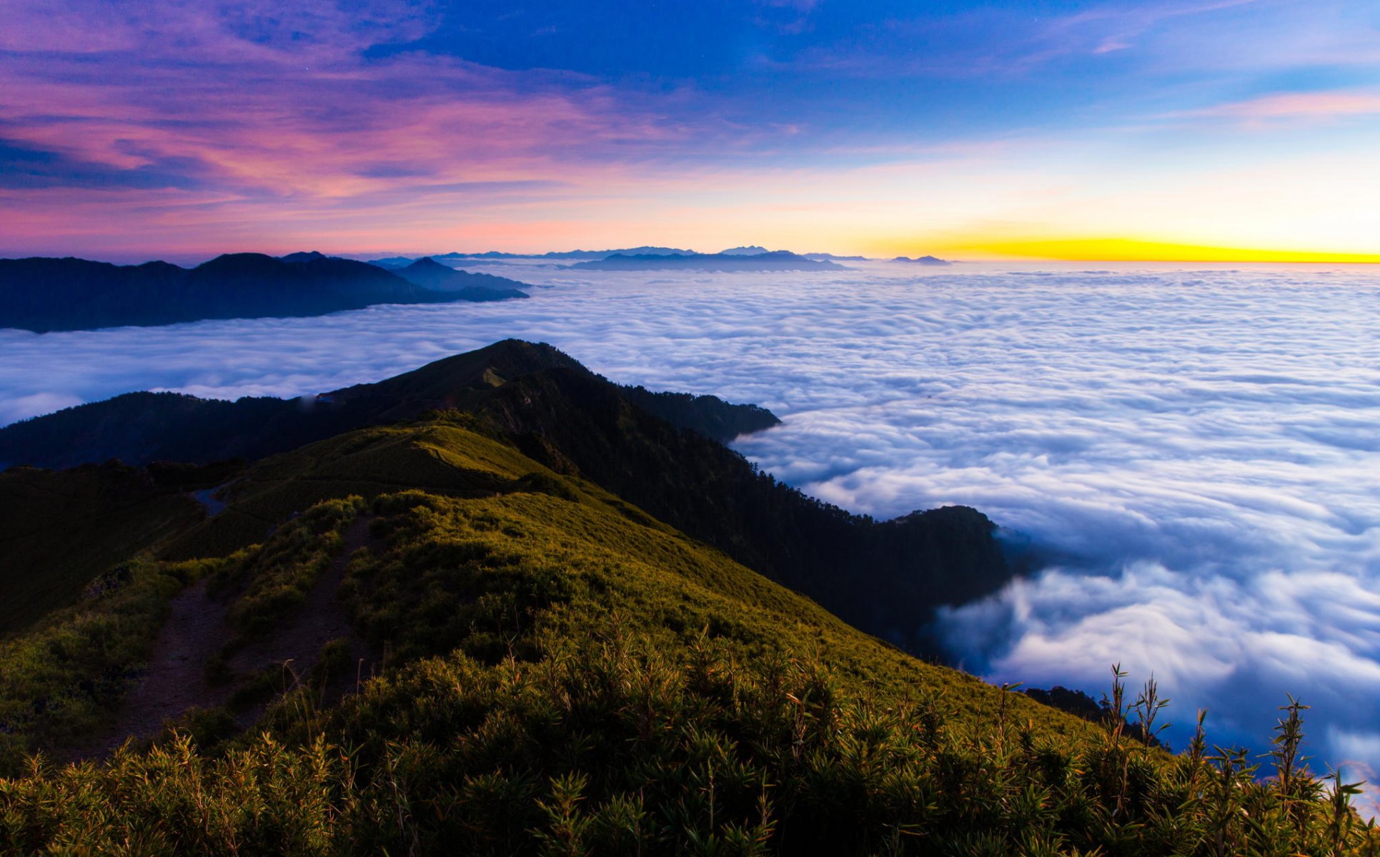 Panorama mañana de montaña sobre las profundidades del mar - fondos de pantalla