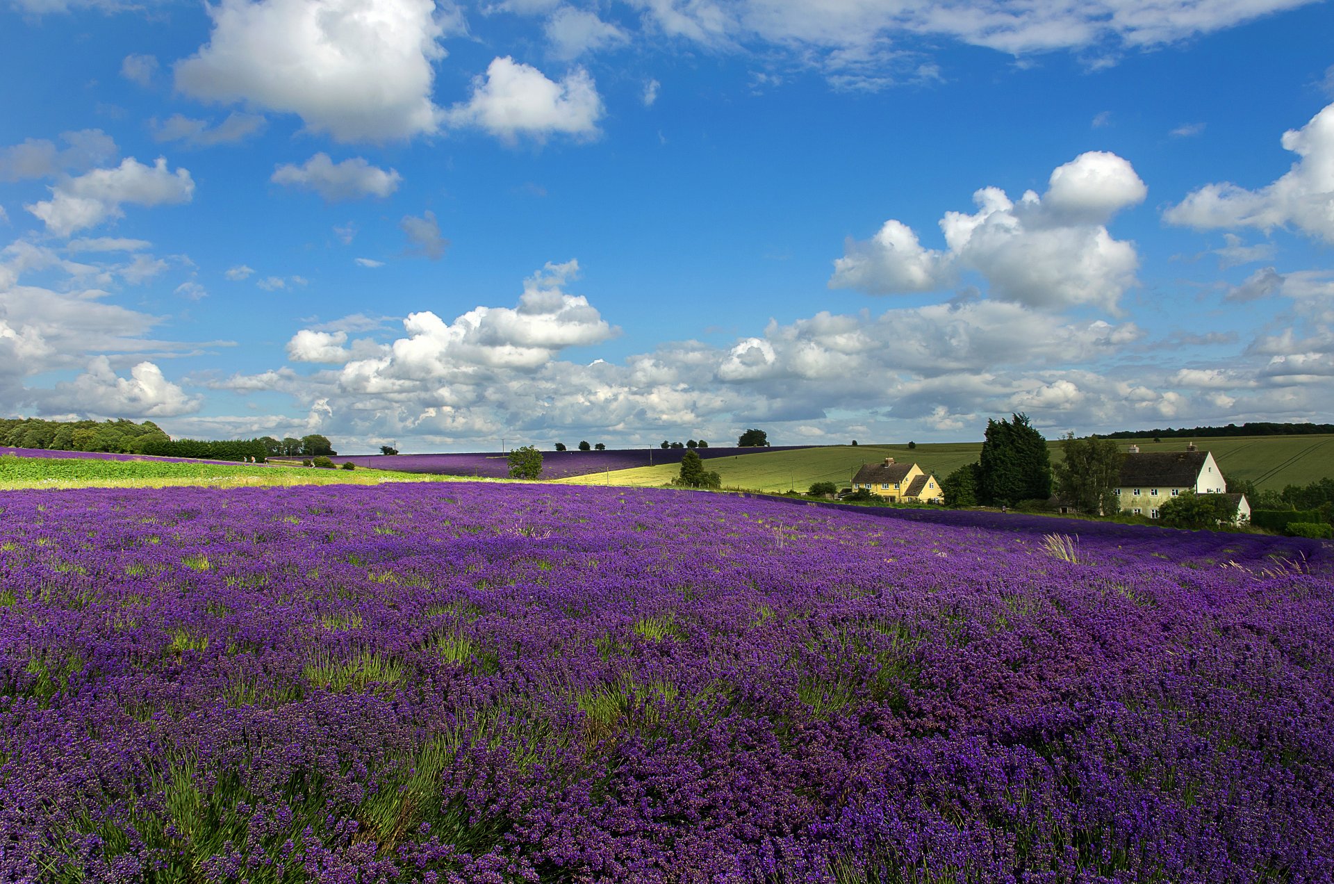 Un día en un campo de lavanda bajo un cielo azul con nubes blancas - fondos de pantalla