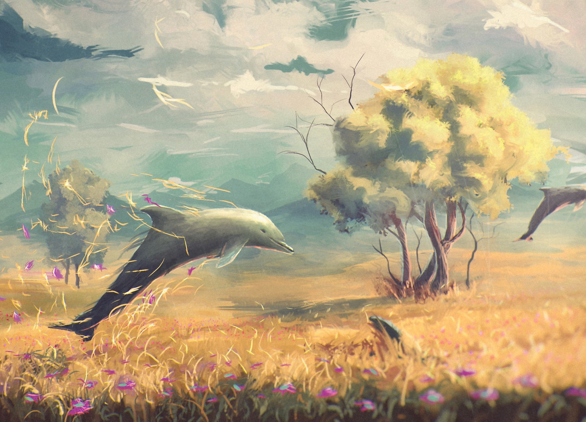 Etiquetas:arte, campo, flores, árbol, delfines, fantasía