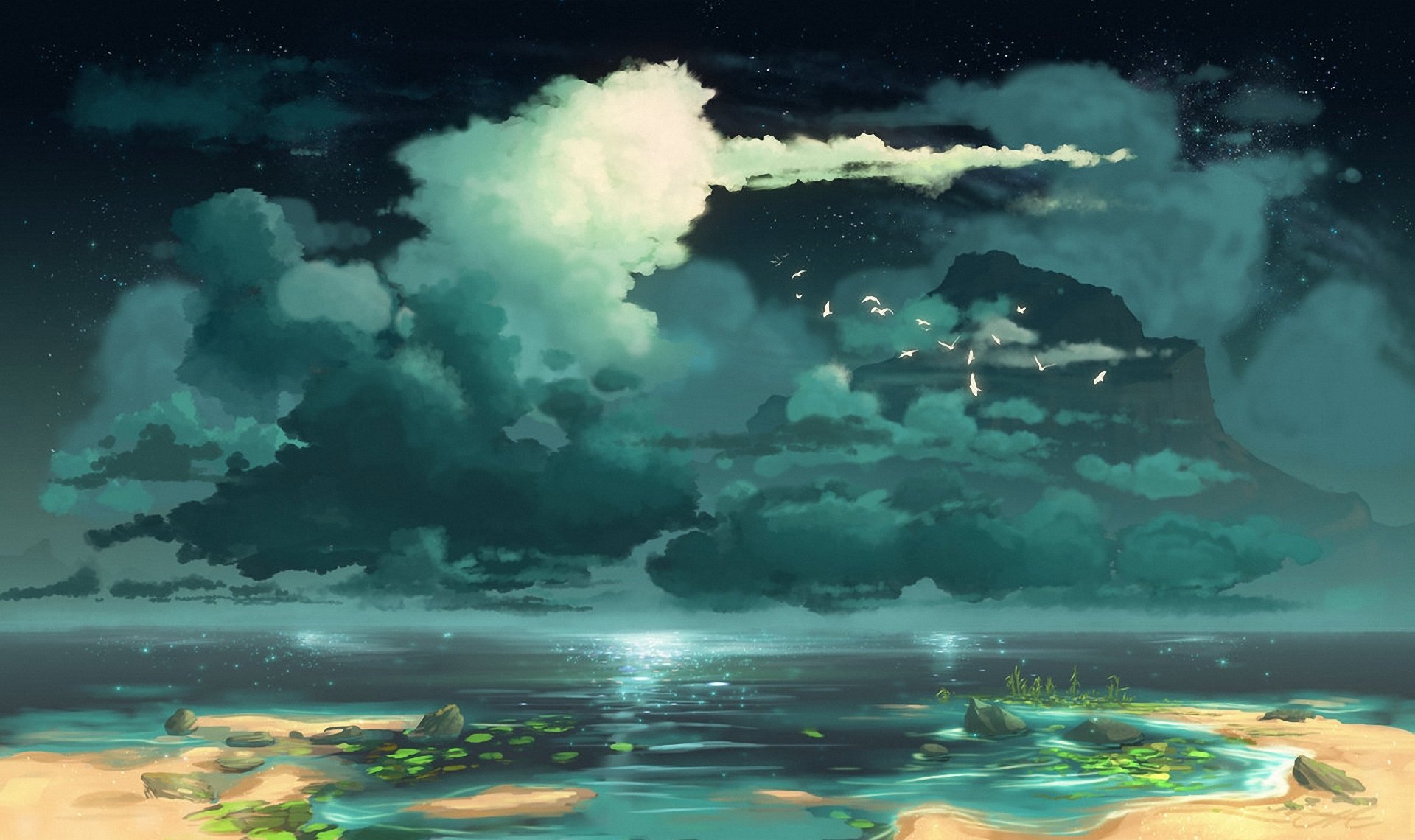 Etiquetas:arte, paisaje pintado, lago, pájaros, nubes