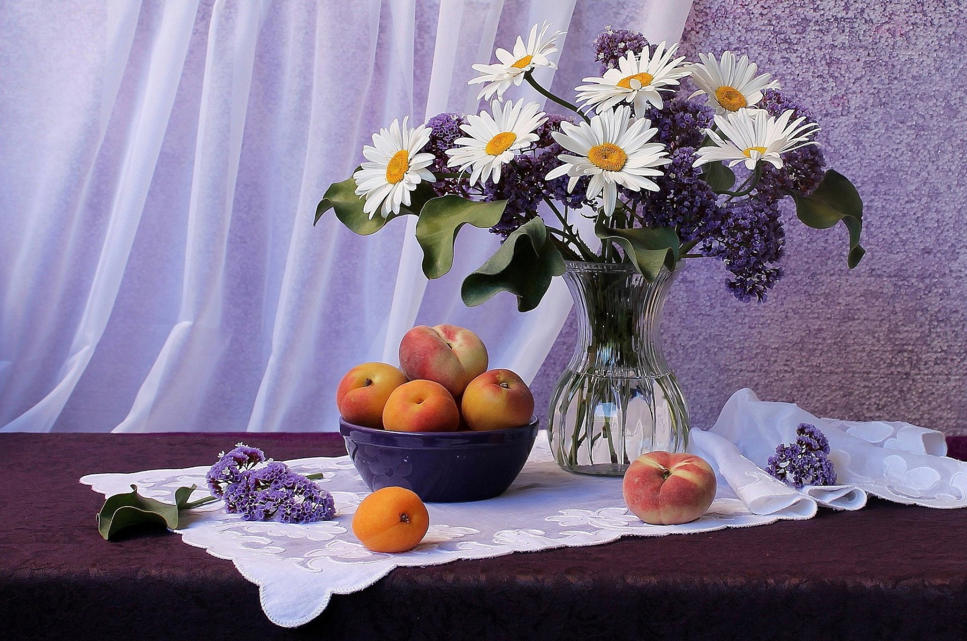 Pintura con melocotones y un ramo de margaritas con lila - fondos de pantalla