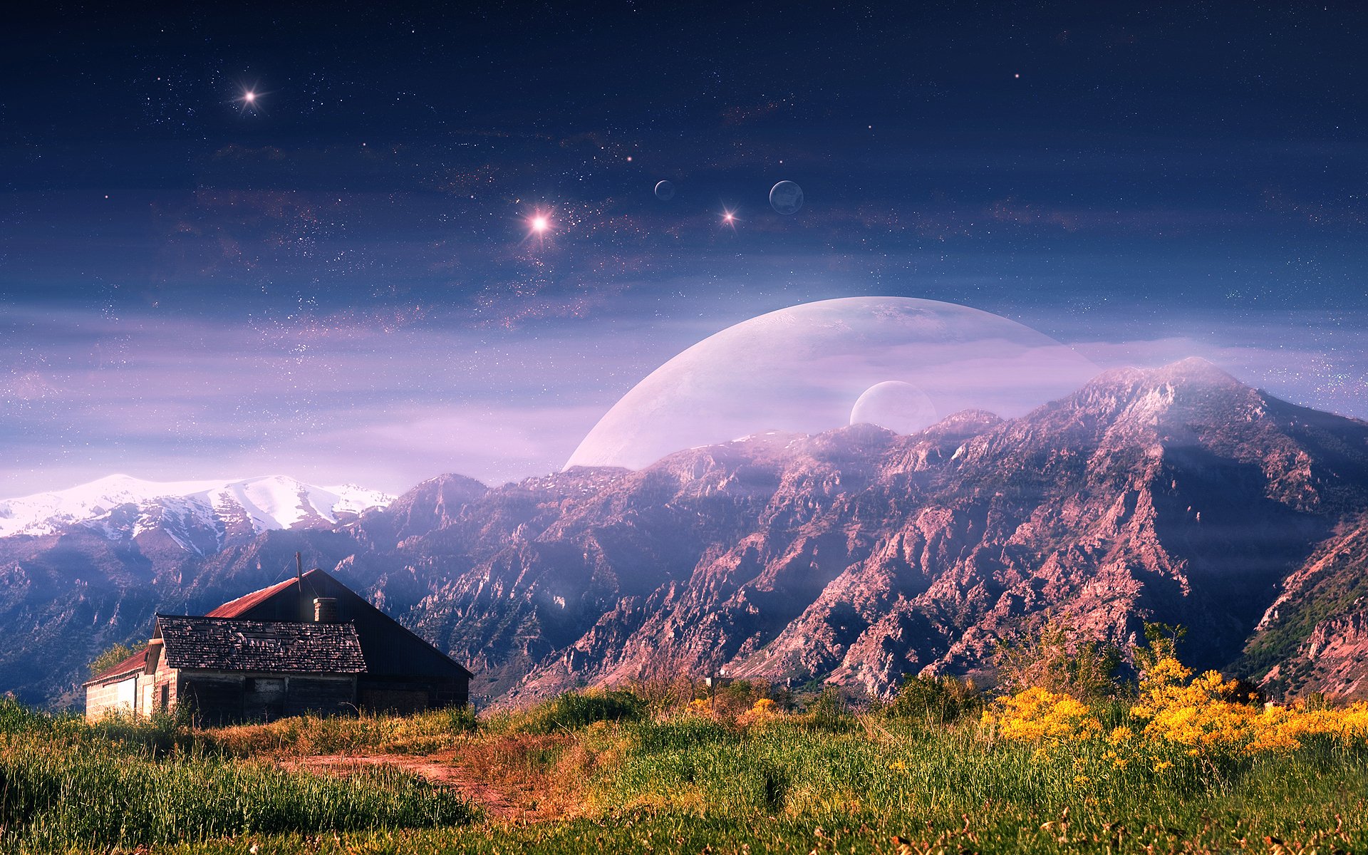 Campo nocturno cubierto de follaje de otoño frente a la casa en el bosque