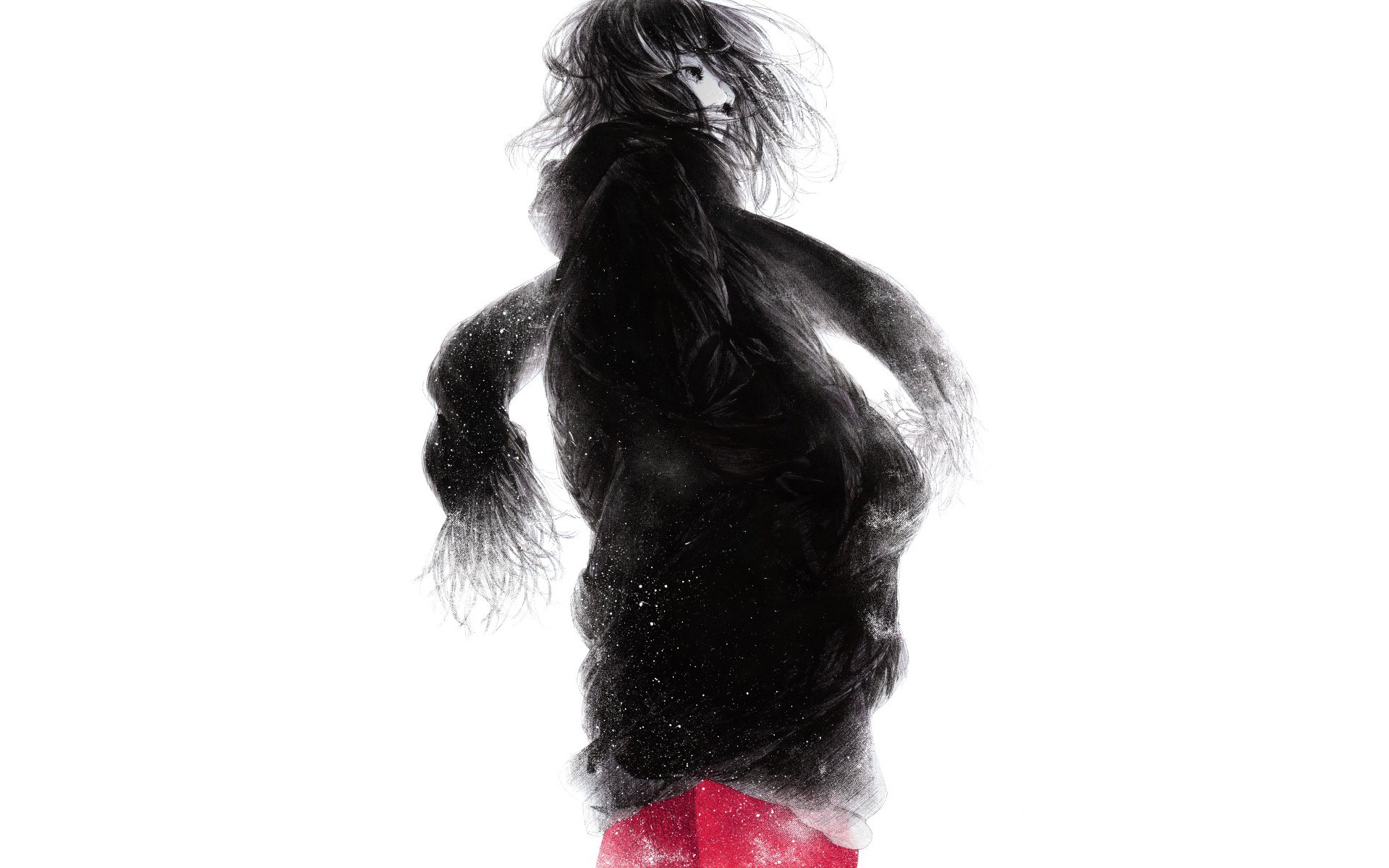 Dibujo de una chica con una bufanda en el viento con copos de nieve