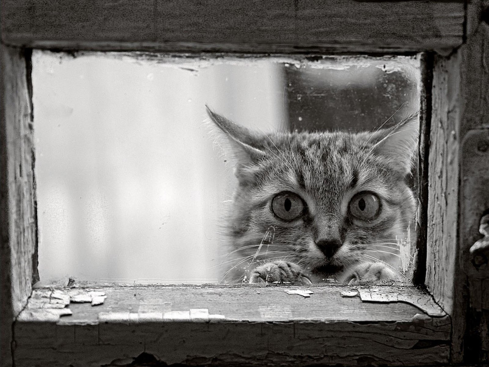 Un gato con una mirada triste en una ventana en blanco y negroUn gato con una mirada triste en una ventana en blanco y negro