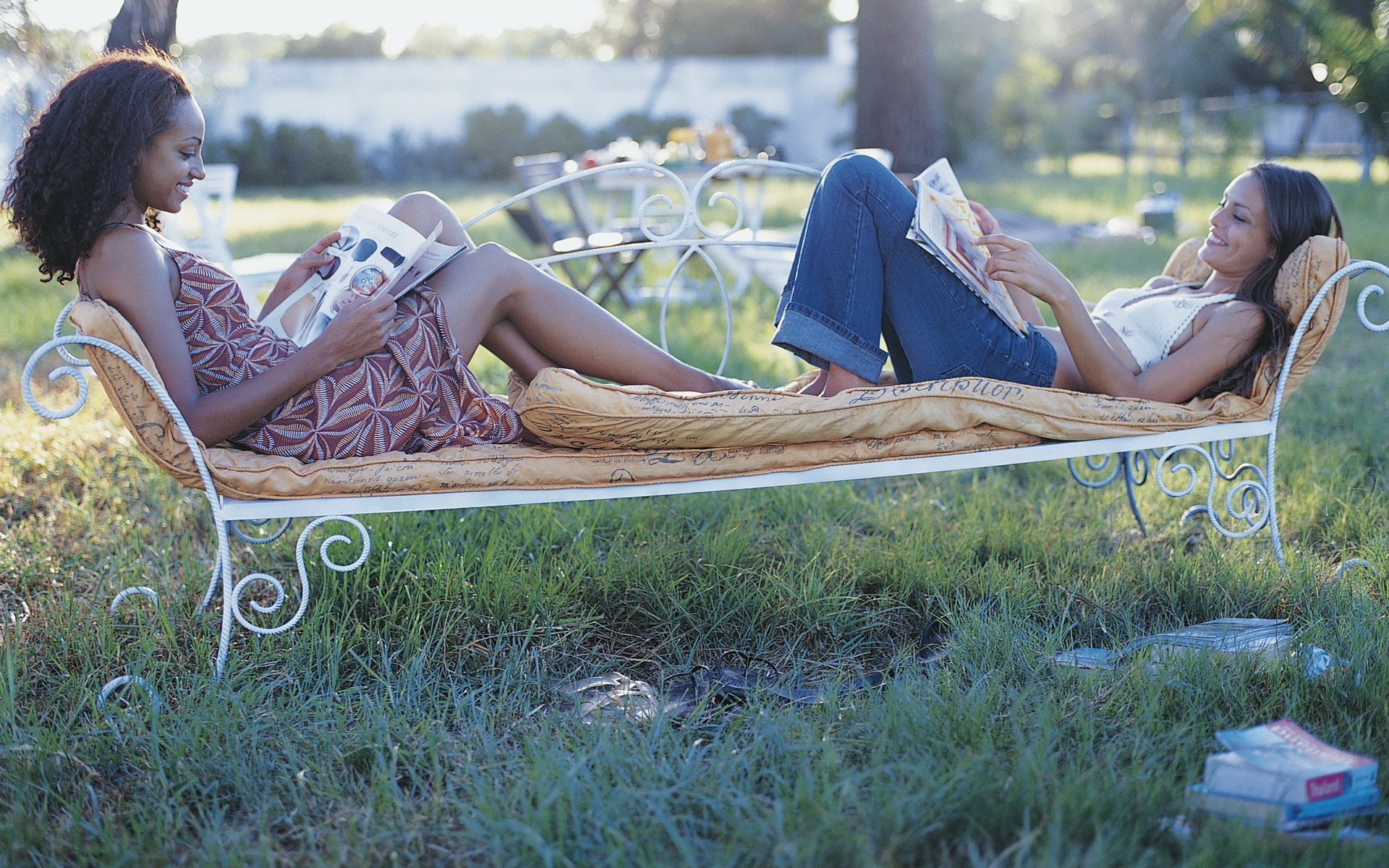 Dos chicas se acuestan en un banco leyendo revistasDos chicas se acuestan en un banco leyendo revistas