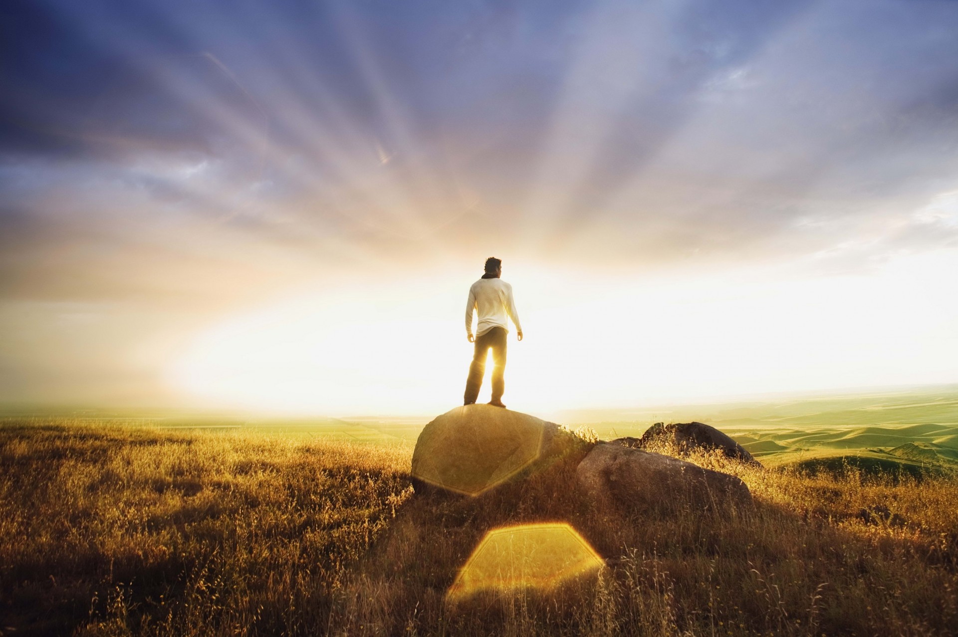En una piedra en los rayos de la puesta de sol hay un hombre