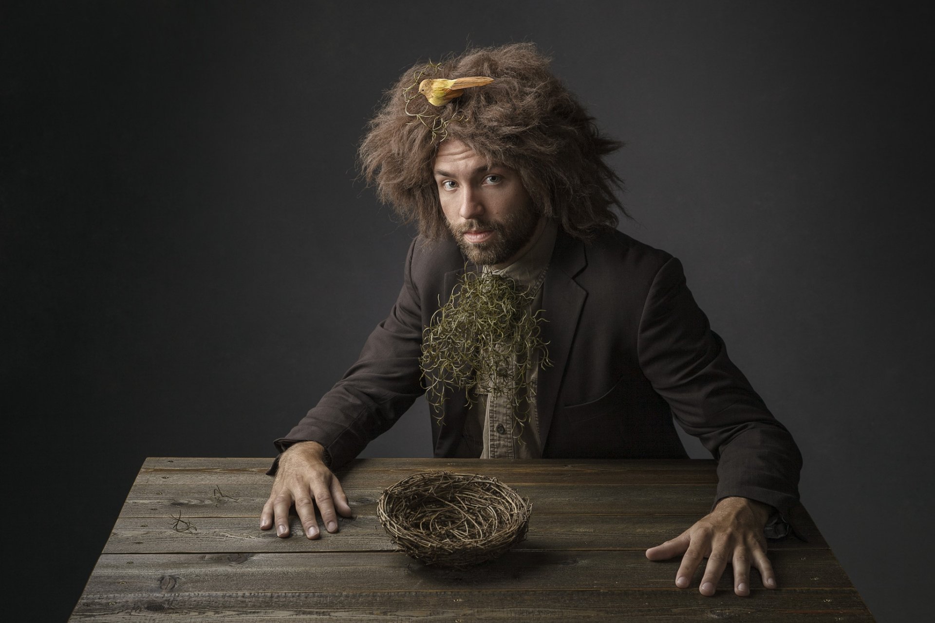 Hombre inusualmente vestido sentado en una mesa de madera